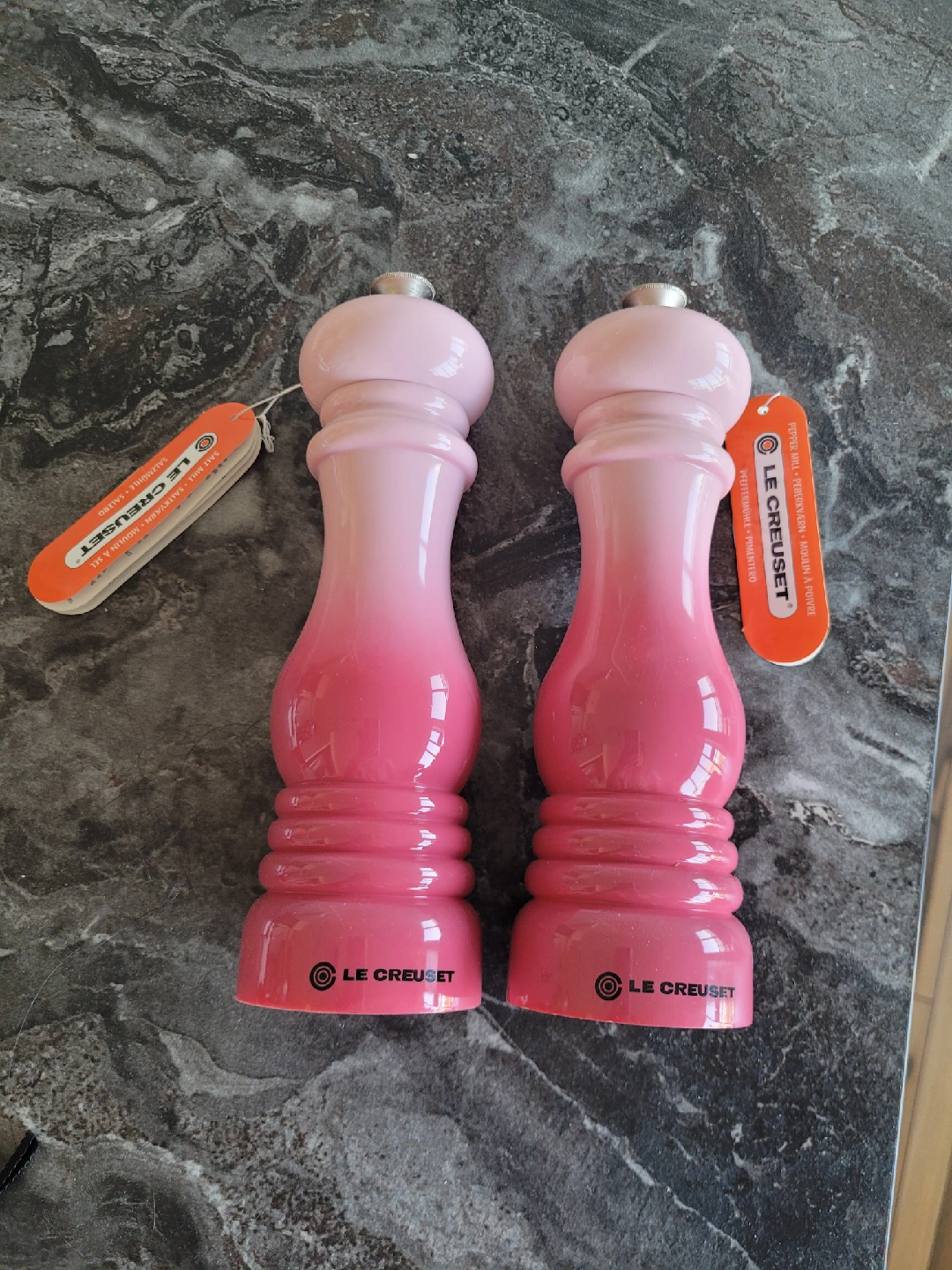 Add a touch of elegance to your table with this Le Creuset salt and pepper mill set. The beautiful pink ombre colour will brighten up any kitchen or dining room. These mills are brand new and ready to grind! They are made by Le Creuset, known for their quality craftsmanship and stylish designs