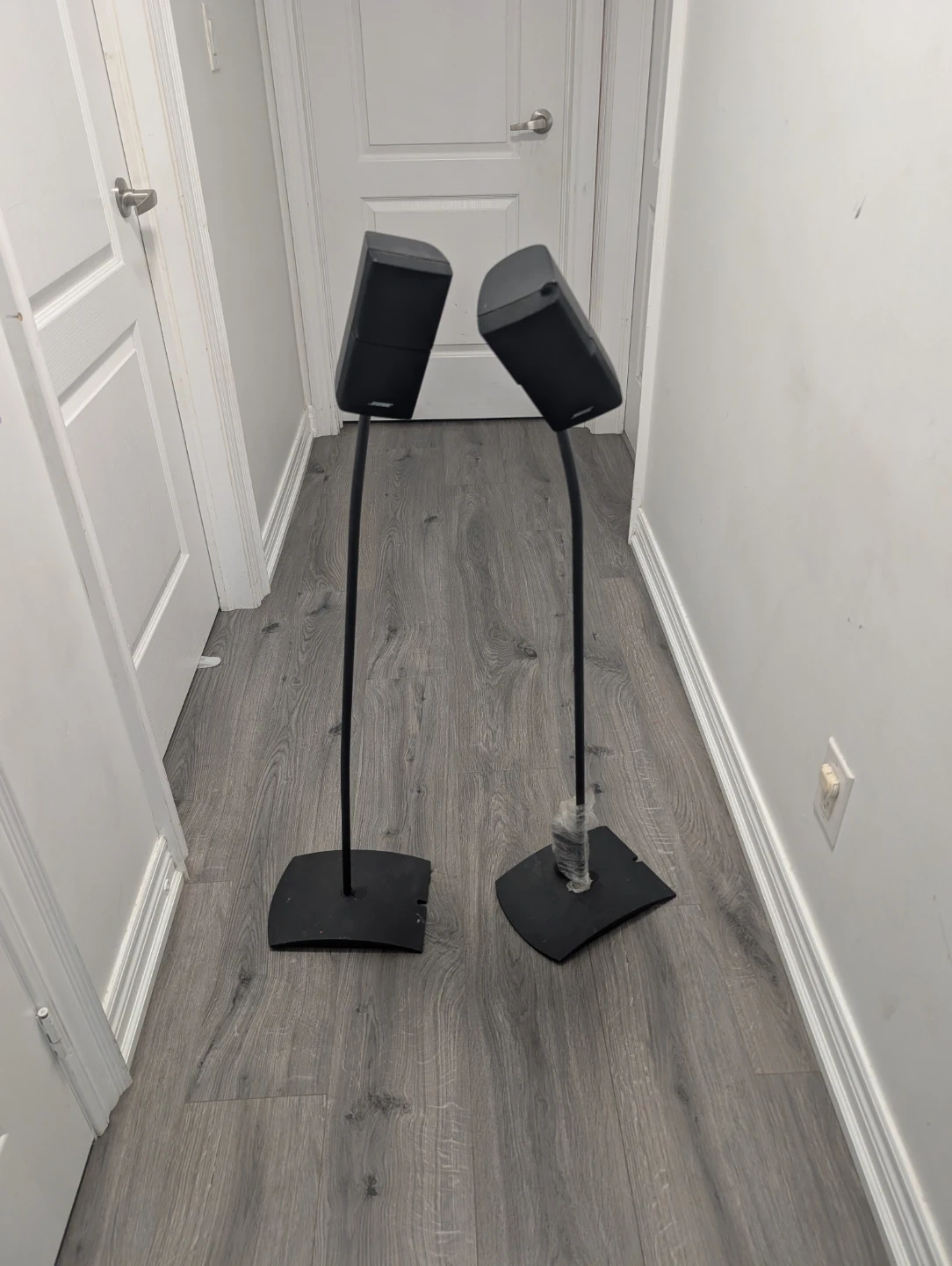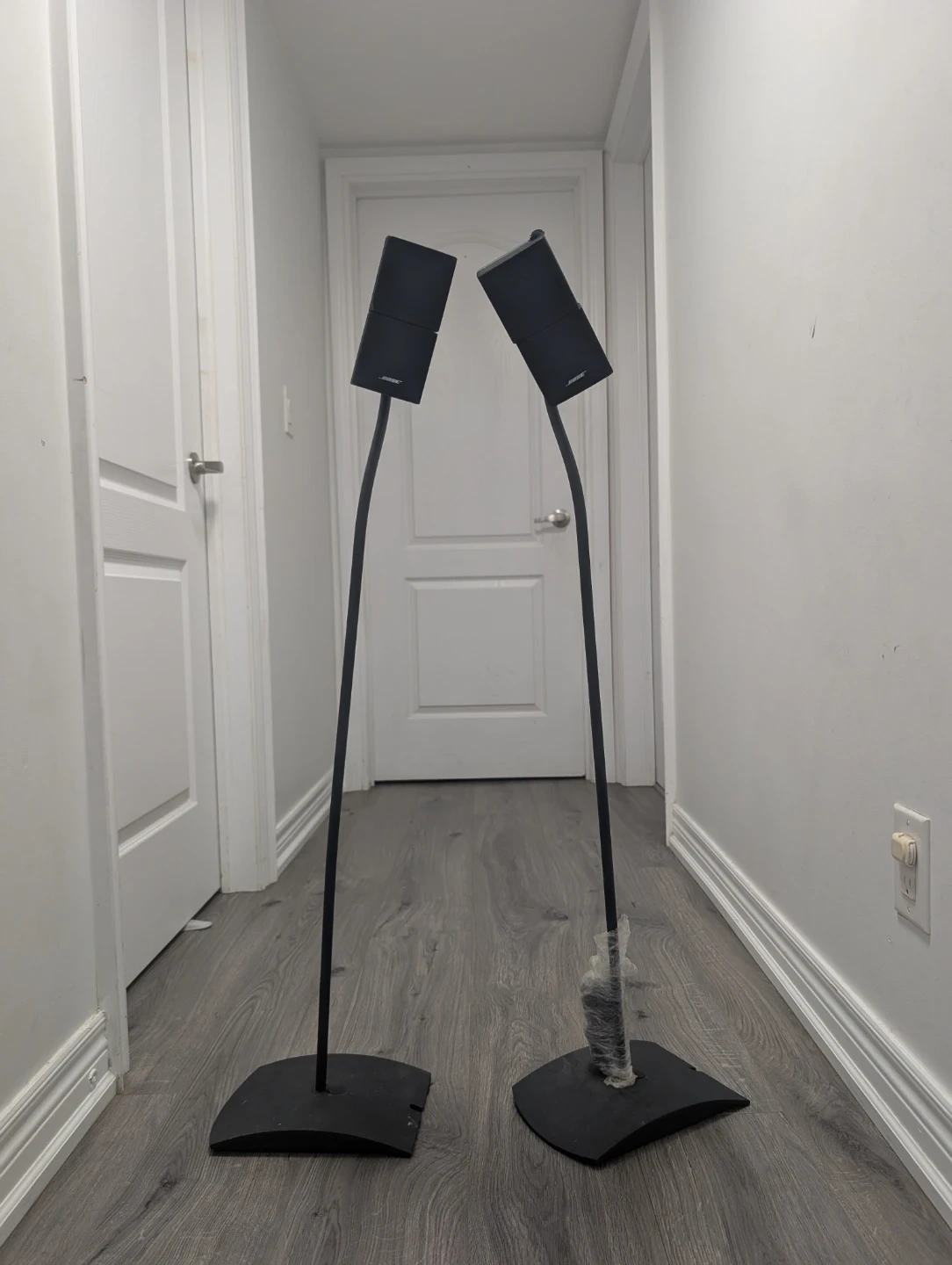 A pair of black Bose speaker stands. These stands are designed to elevate your speakers for optimal sound placement. They're made of metal and have a sturdy base for stability.