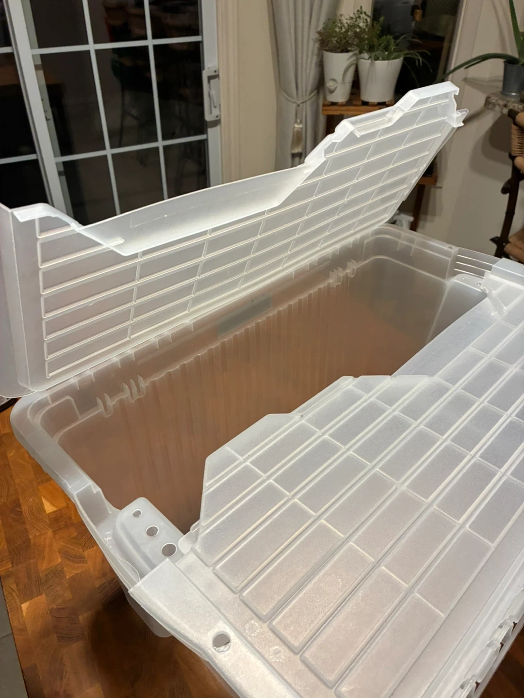 This is a large, clear plastic storage bin with a hinged lid. It's great for organizing items in your home or garage. The clear design lets you see what's inside without opening it. It's made of durable plastic.