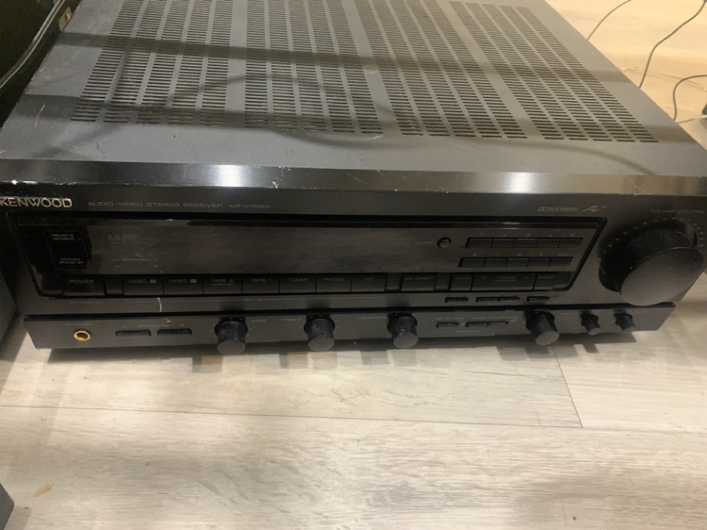 Kenwood Audio-Video Stereo Receiver, model KR-V7020. It's a black stereo receiver with multiple input and control options. This receiver provides audio and video capabilities.