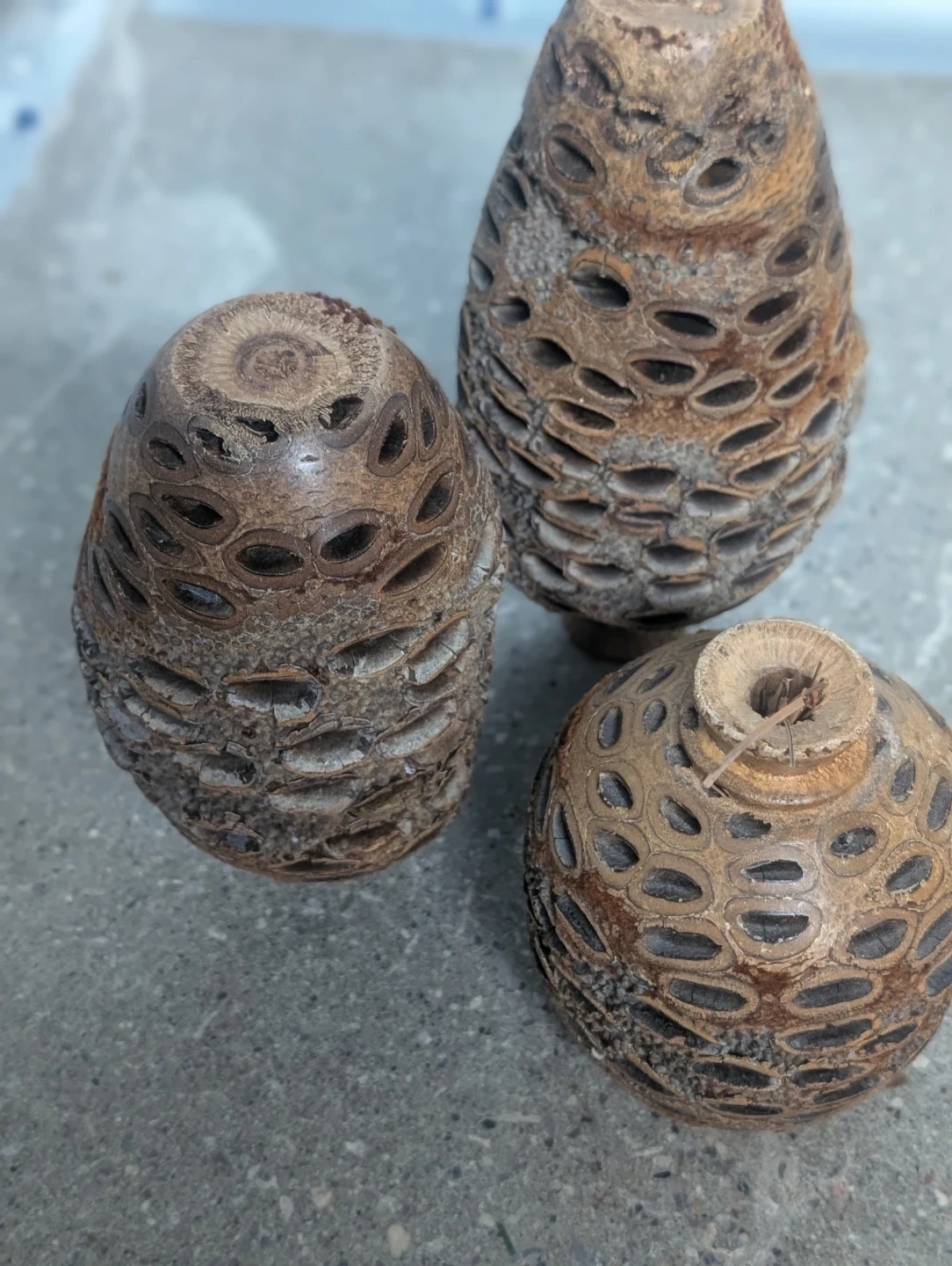 Three natural Banksia seed pods. These unique botanical specimens have a distinctive honeycomb-like appearance with many small holes. They're approximately 3-5 inches tall and vary slightly in shape. Great for crafting or rustic decor!