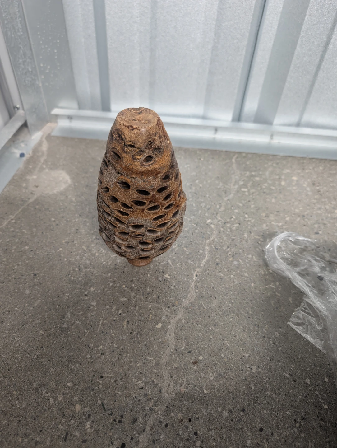 Three natural Banksia seed pods. These unique botanical specimens have a distinctive honeycomb-like appearance with many small holes. They're approximately 3-5 inches tall and vary slightly in shape. Great for crafting or rustic decor!