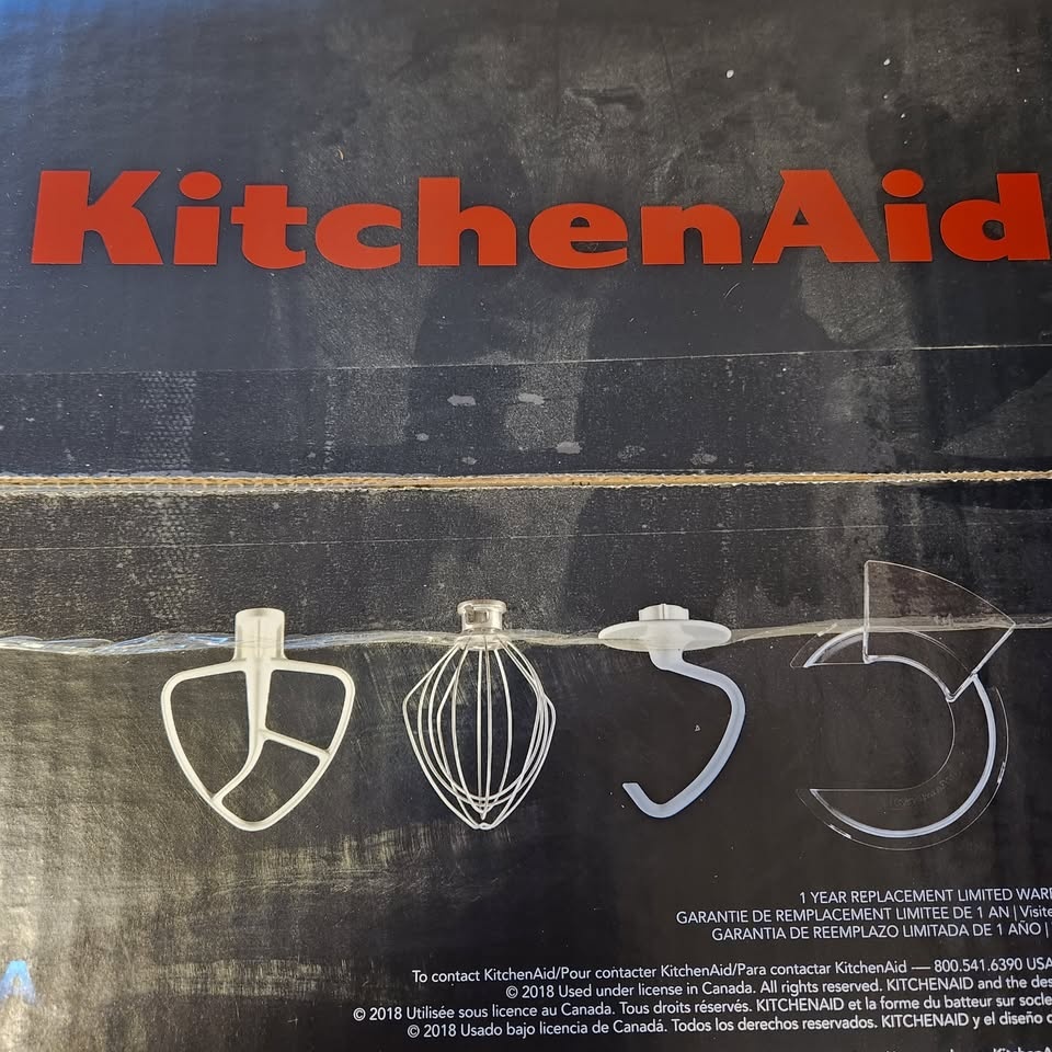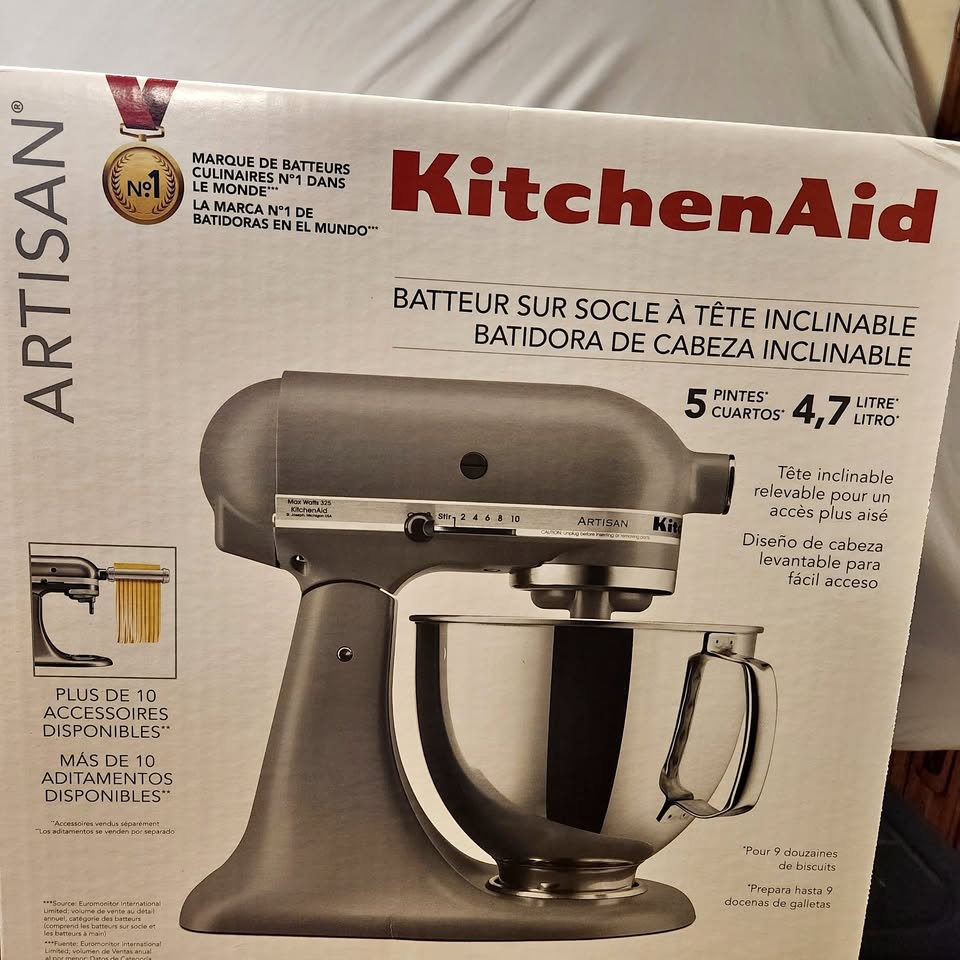 Brand new, sealed box KitchenAid Artisan 5-Qt Tilt-Head Stand Mixer in Matte Grey. This high-quality mixer is perfect for baking breads, pastries, cookies, doughs, and more. Comes with 4 paddles (see photo 3). Many handy accessories can be purchased separately, making it a very functional appliance with a wide array of applications. Pickup near North Burnaby Secondary School. Cash preferred.
