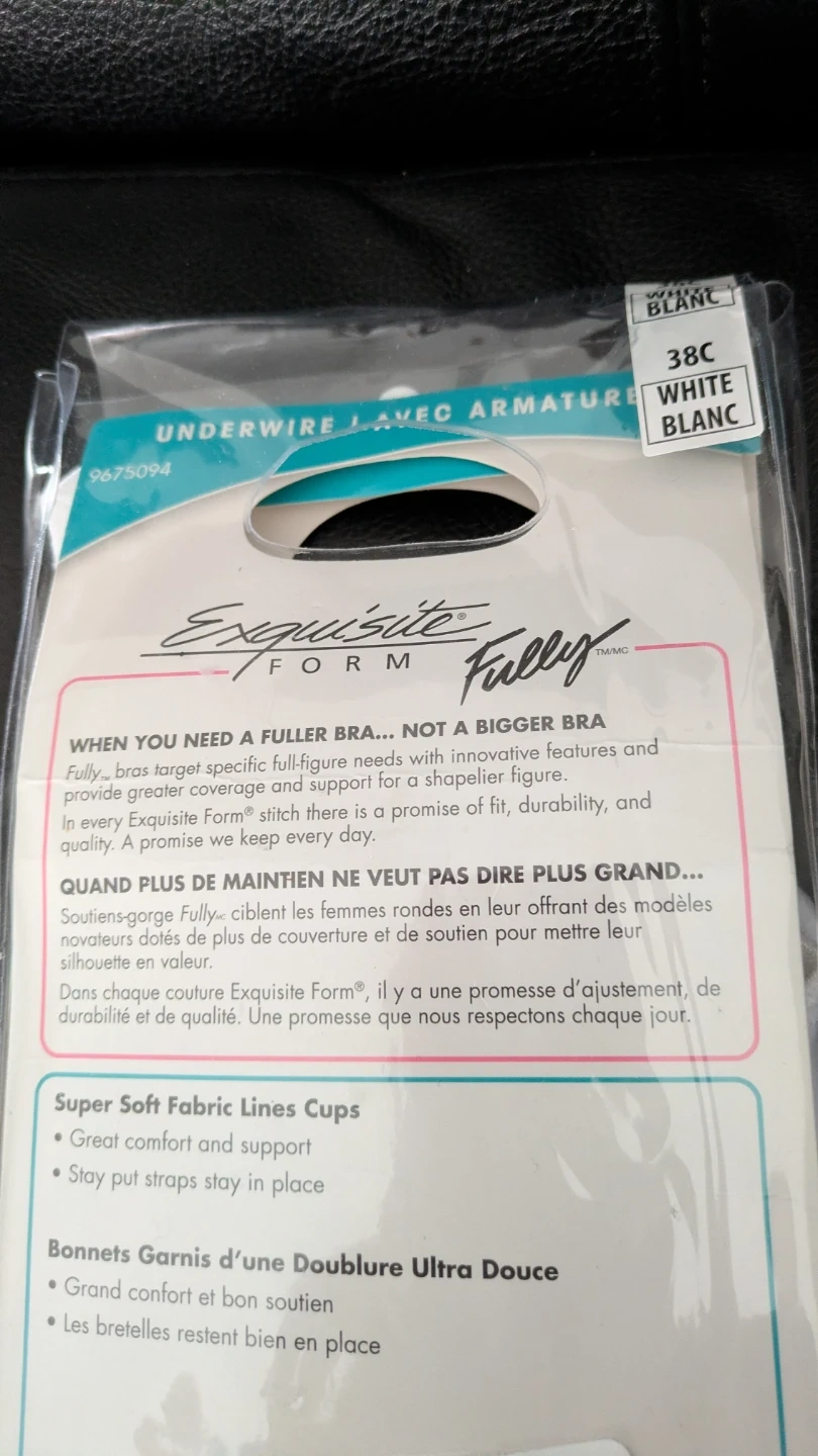 'Exquisite Form' underwire bra. Size 38C. Super soft fabric lines the cups. Great comfort and support when you need a fuller bra..not a bigger bra. Comfort U-back and stay put straps.