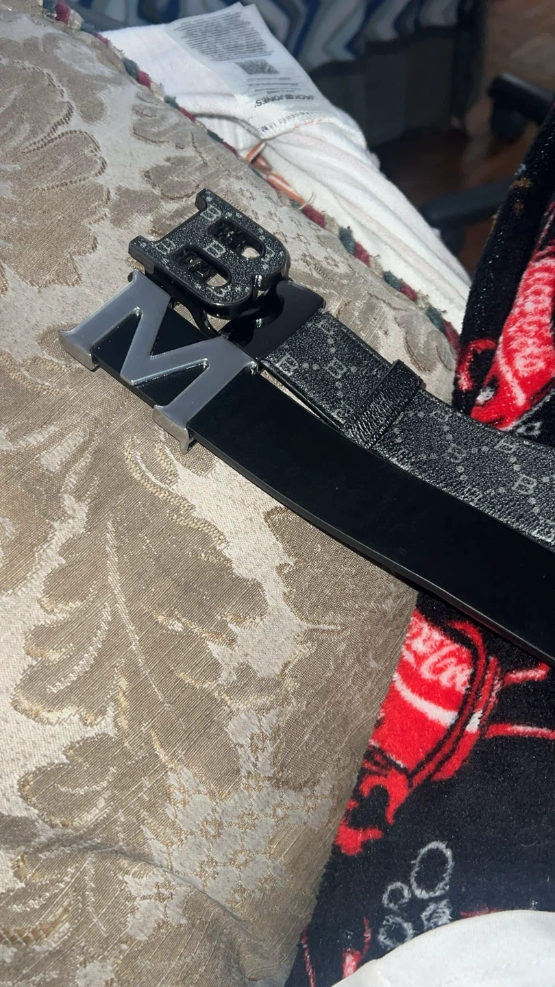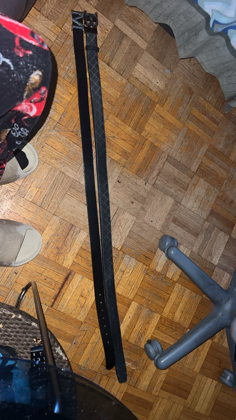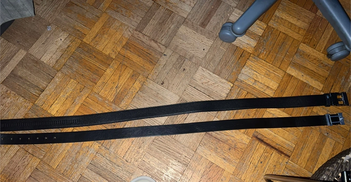 Two black belts are included in this set. One is a classic leather belt with a silver buckle. The other features a repeating pattern and a black buckle. They're ready to add a touch of style to any outfit!