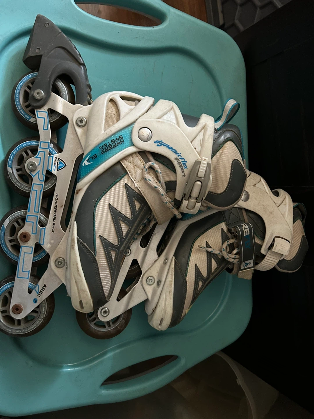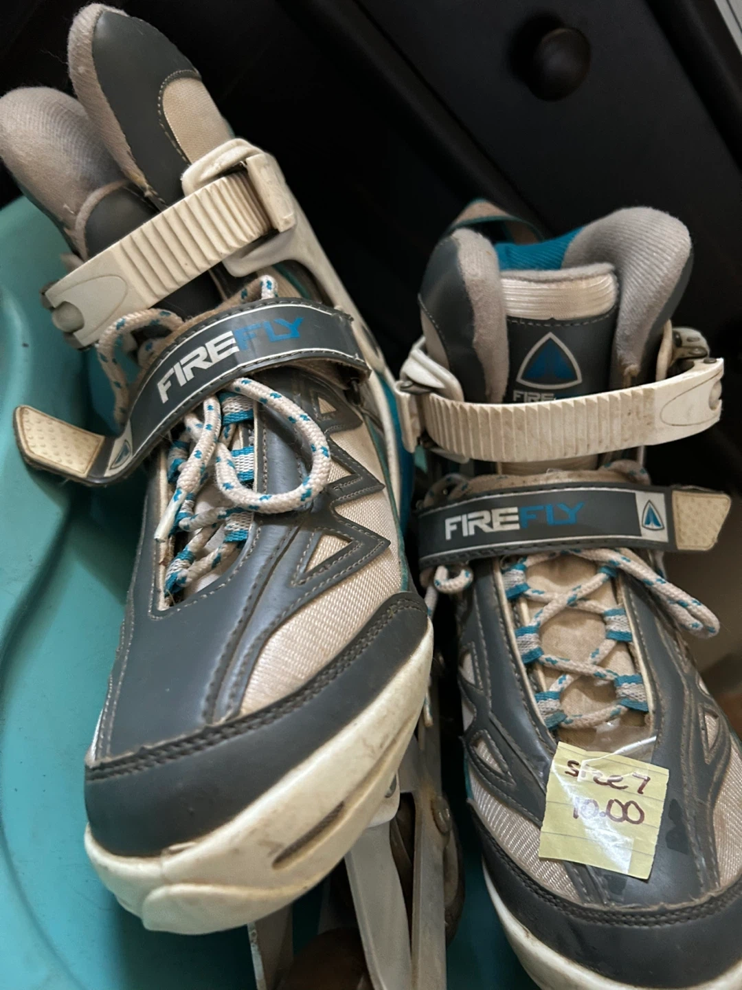 Used Firefly inline skates in size 7. These skates are grey and teal with white accents. They feature laces, velcro straps, and buckles for a secure fit.