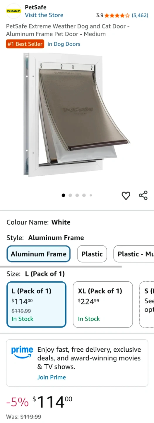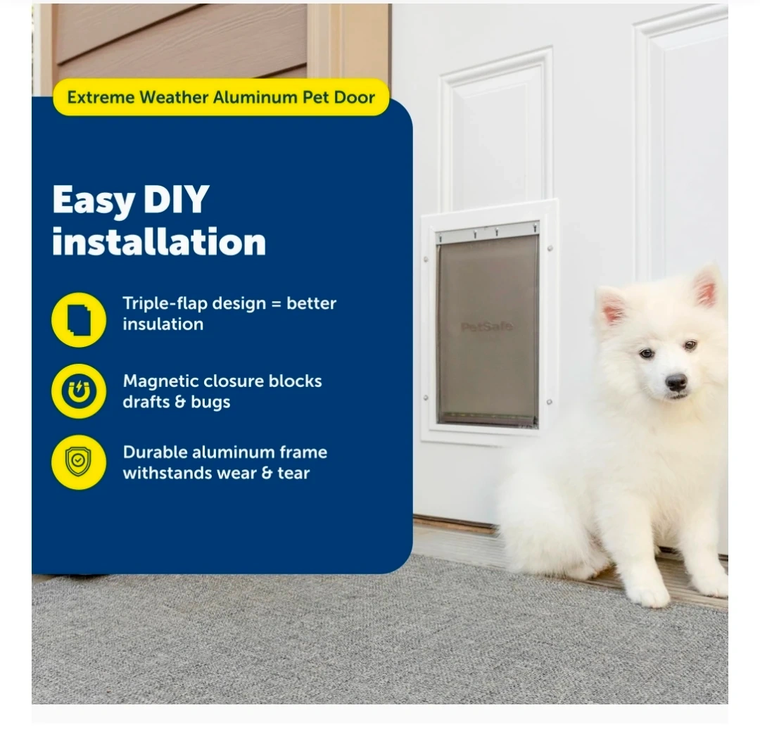 Give your furry friend the freedom they deserve with this large PetSafe Extreme Weather Pet Door! This new, is perfect for larger dogs from 1-100 lbs, and will withstand Canadian winters. The triple-flap insulation keeps the cold out, while the durable aluminum frame ensures years of reliable use. Easily installs in most exterior doors including paneled, wood, PVC and metal doors 1 1/2 - 2 inches thick.
