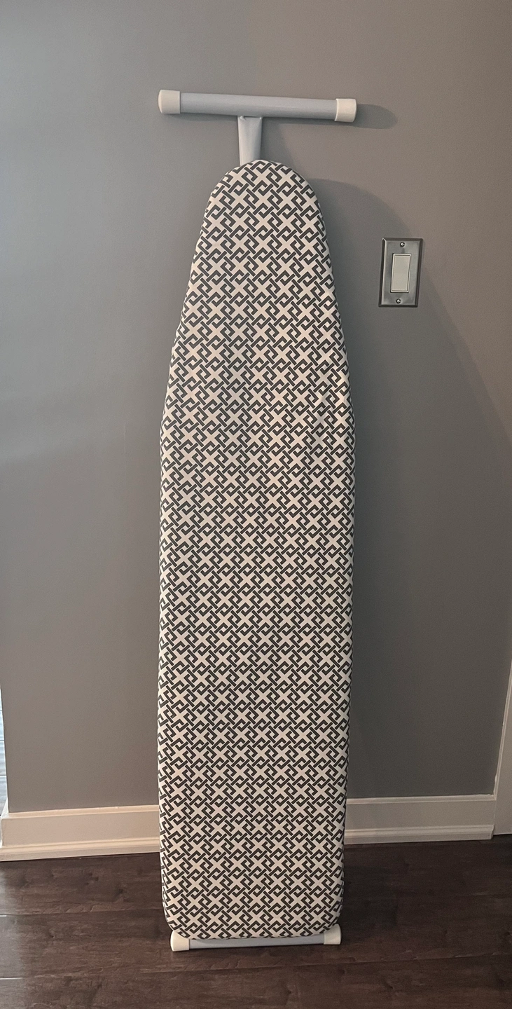 Gently used ironing board with white and grey cover. Folds easily to store. Standard size.