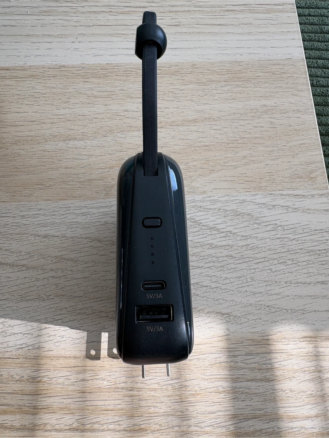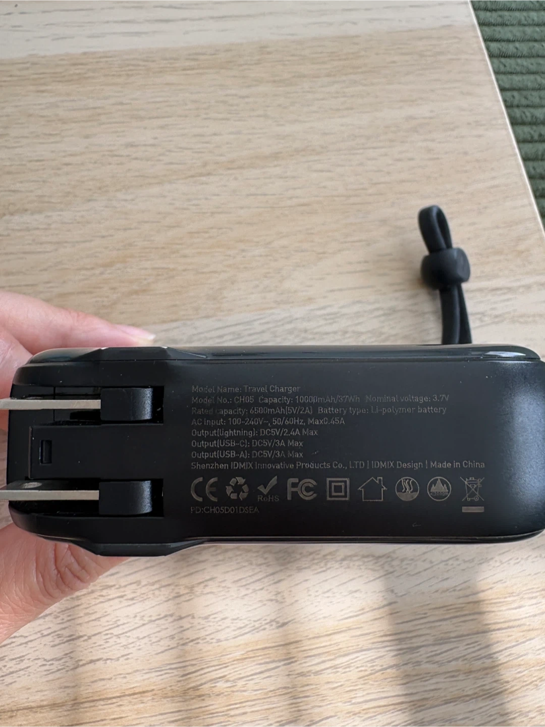 This IDMIX travel charger has a 10000mAh capacity and built-in AC plugs. It features two USB-A ports for charging devices. It's a black colour and is great for travel!