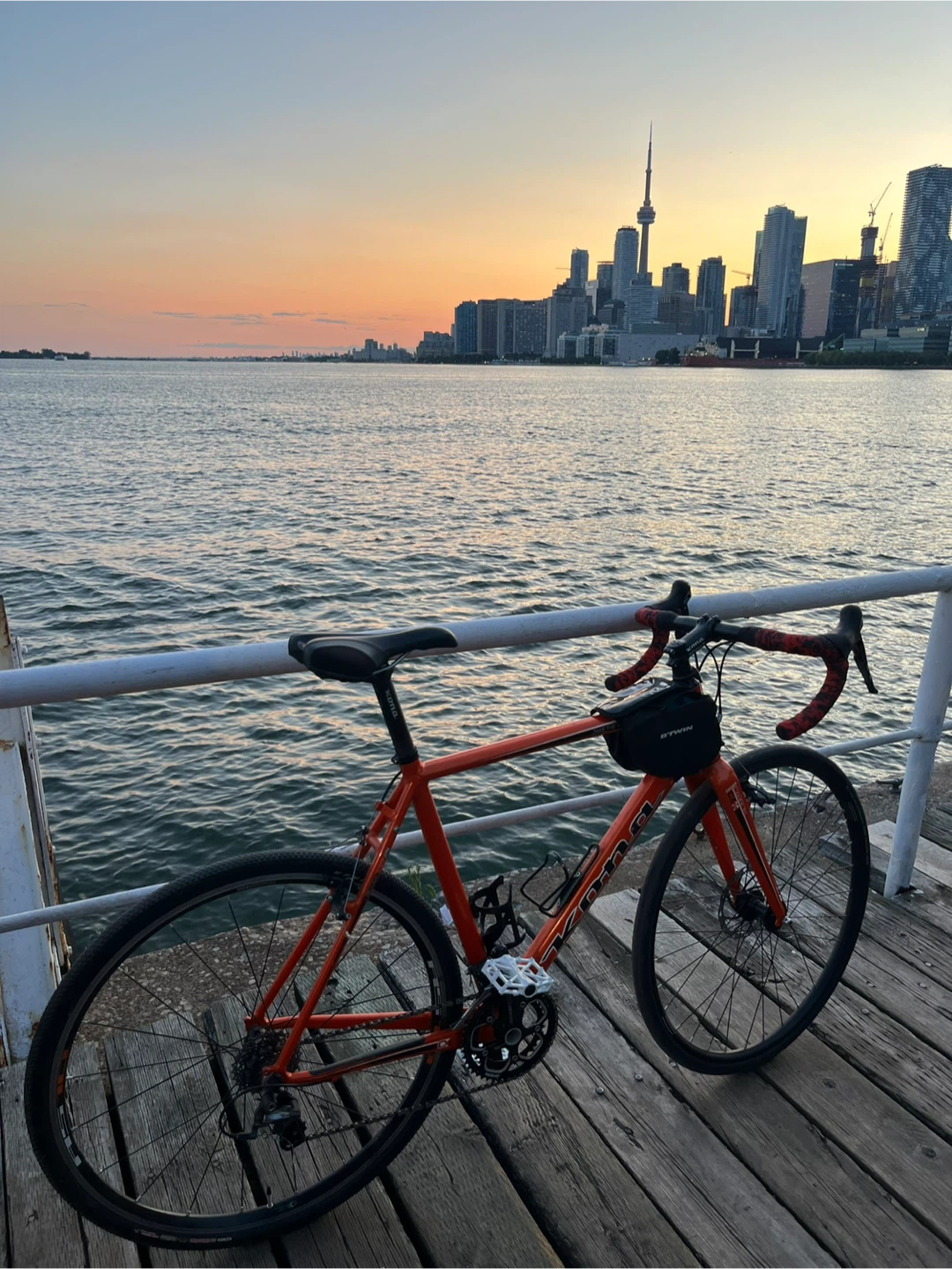 This orange Kona cyclocross bike is ready for adventure. It features drop handlebars and disc brakes for reliable control on varied terrain. It's equipped with pannier racks and bags, making it suitable for touring or commuting. It's a versatile ride for cyclists who tackle different surfaces!
