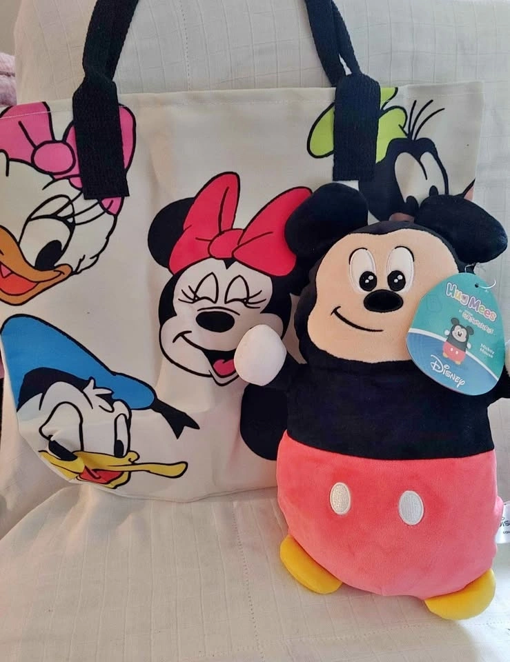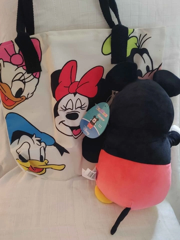 (1) a canvas tote bag featuring Donald Duck, Daisy Duck, Minnie Mouse, and Goofy.