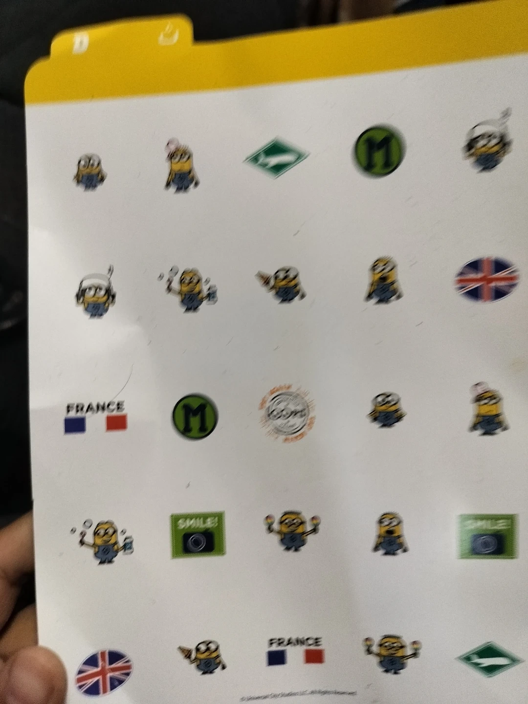 A sheet of Minions chracters featuring various characters and designs, including flags of France and the UK. They're great for decorating notebooks, laptops, or personal items. Perfect for any Minions fan!