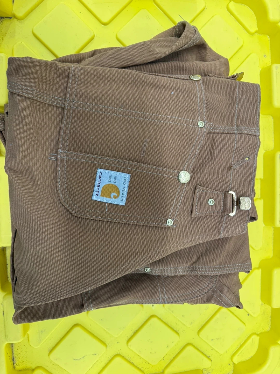 Carhartt canvas bib overalls in a classic brown colour. These are size 42x32. Durable and built to last, they're ready for your next project!