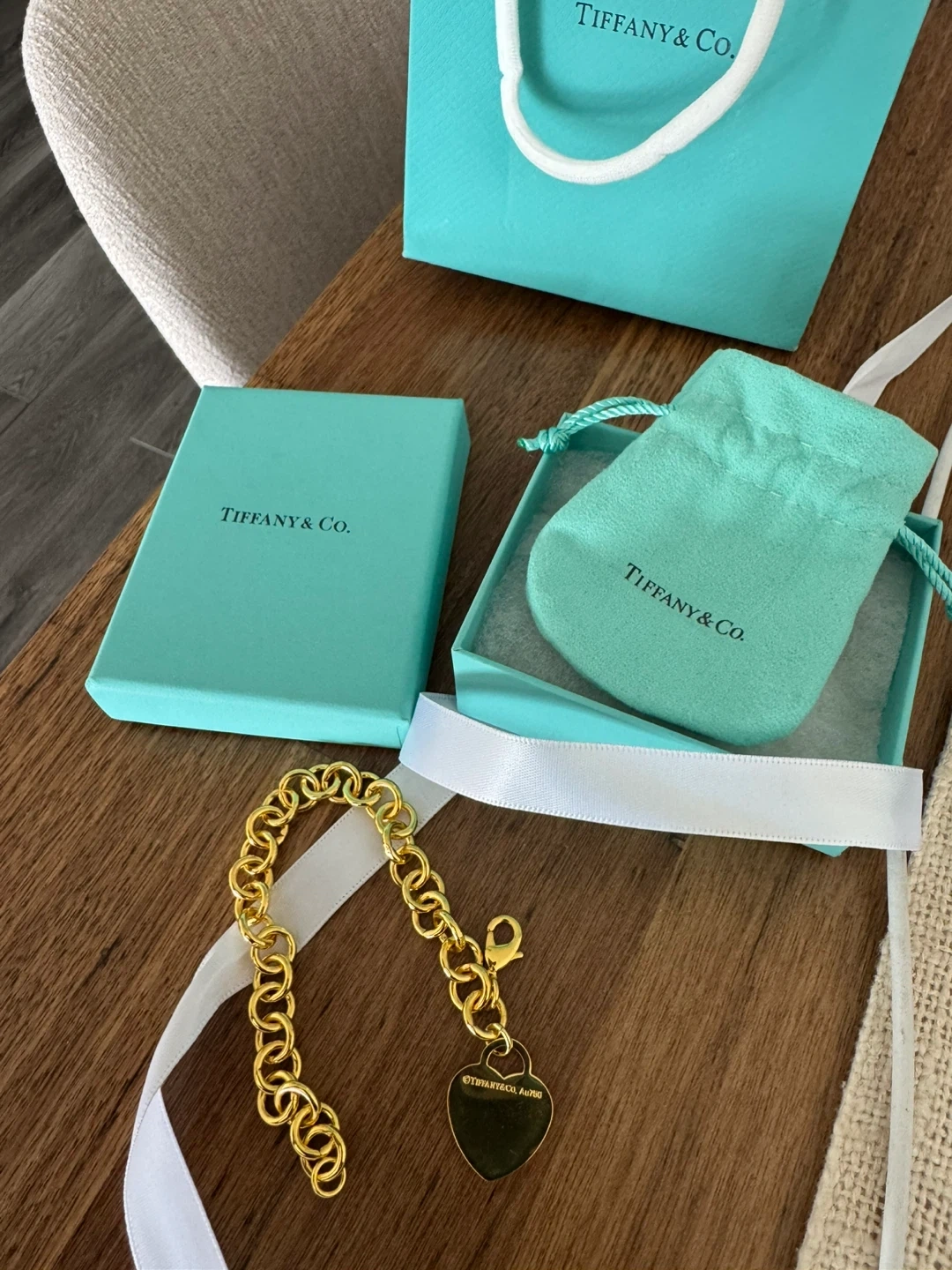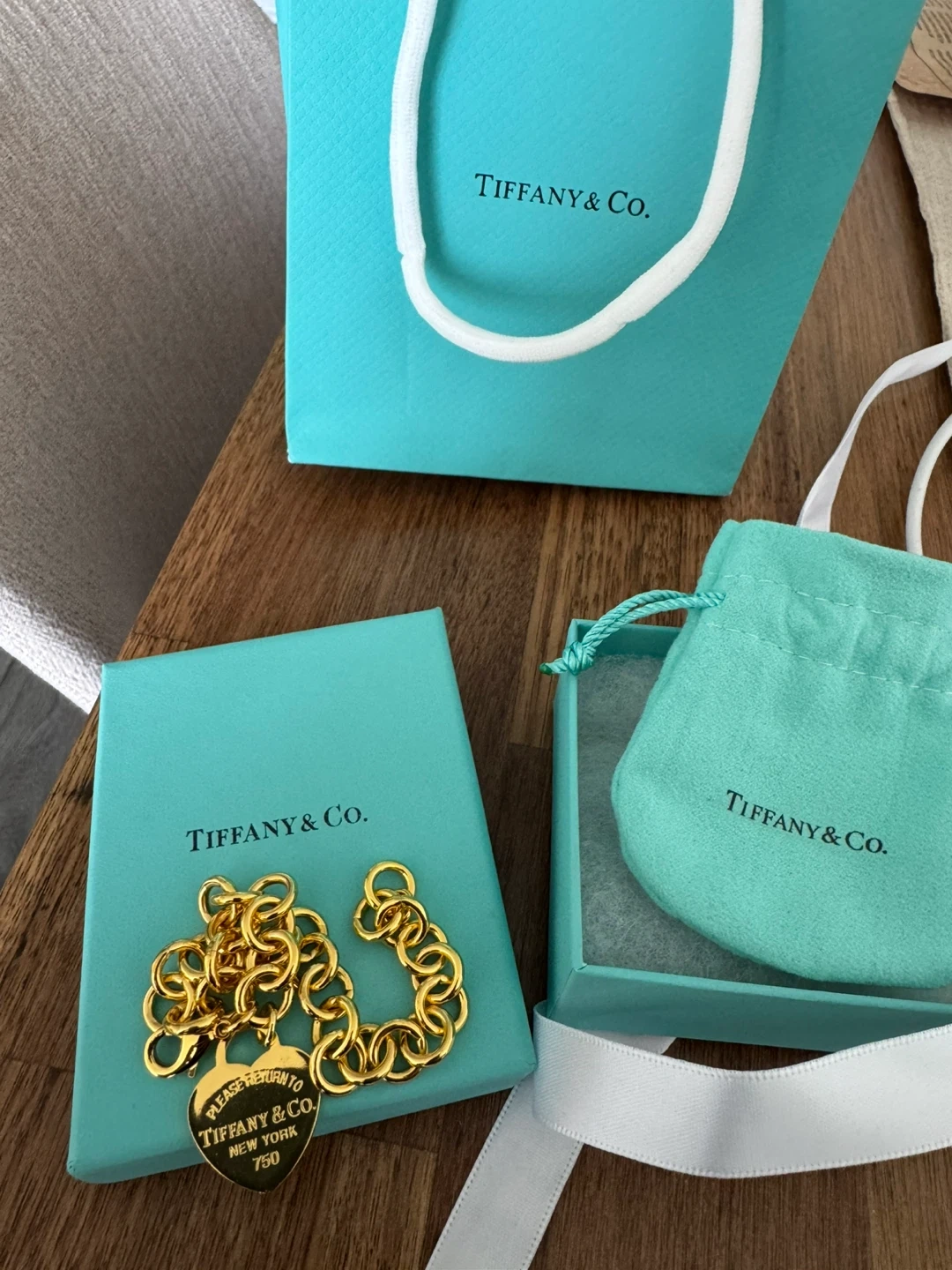 Tiffany & Co. bracelet with the iconic heart charm. Comes with original box, pouch, and shopping bag. Gold tone finish.