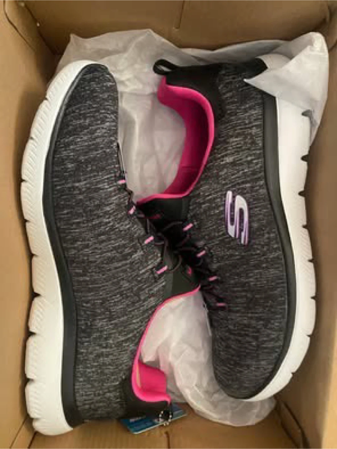These Skechers running shoes are black and pink with a heathered grey knit upper. They feature a comfortable lace-up design and a supportive white sole. Perfect for your daily runs or walks!