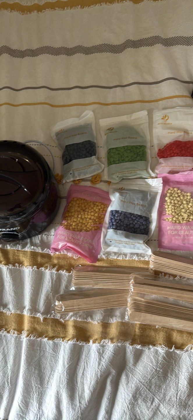 Wax warmer and various colours of hard wax beans. Includes many wooden spatulas. Ideal for at-home waxing.