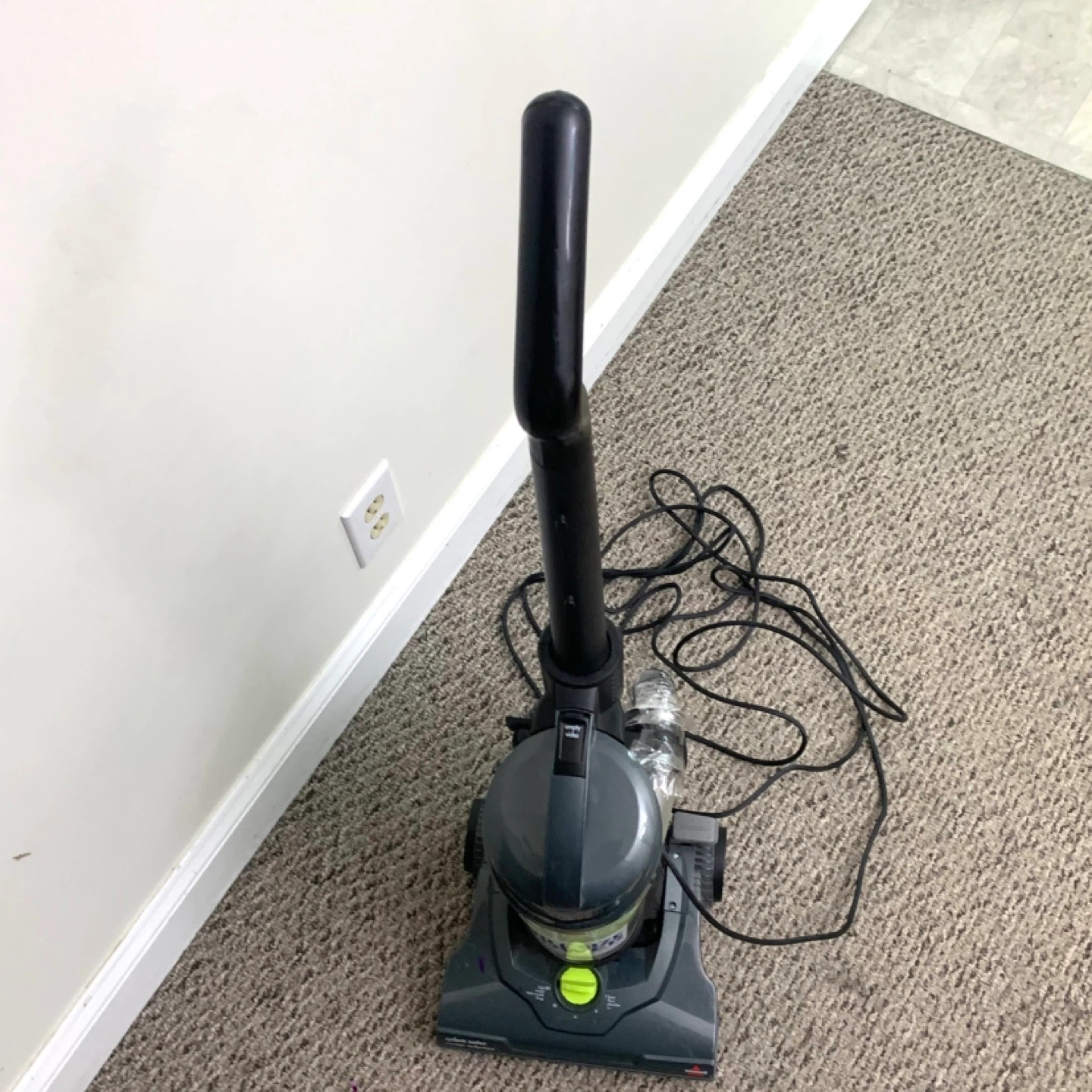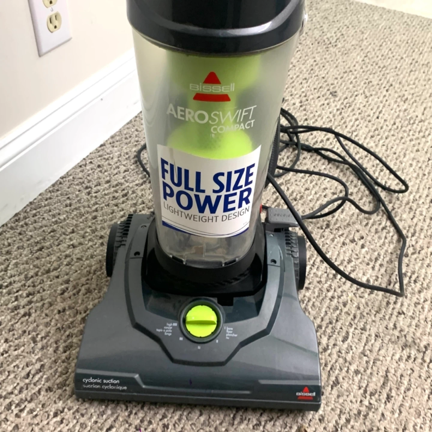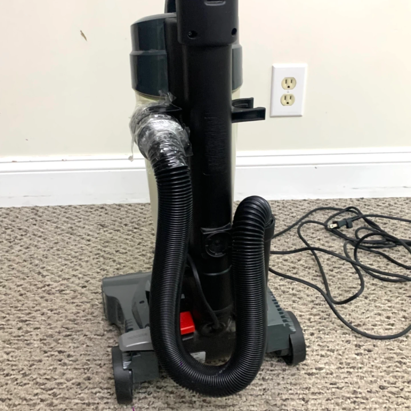 Bissell vacuum cleaner compact upright model 1808E – lightweight design with cyclonic suction, great for parts or repair. Unit runs but has suction loss due to air leak where hose was taped and likely missing internal tubing piece. Ideal for someone handy with vacuums or for parts use.