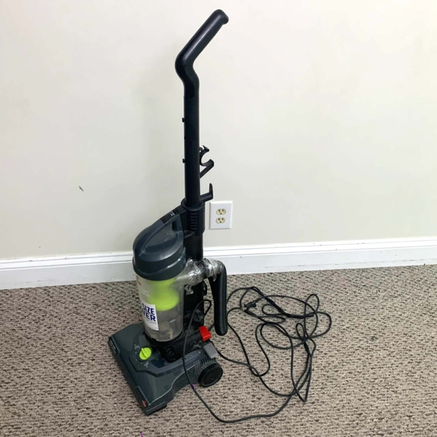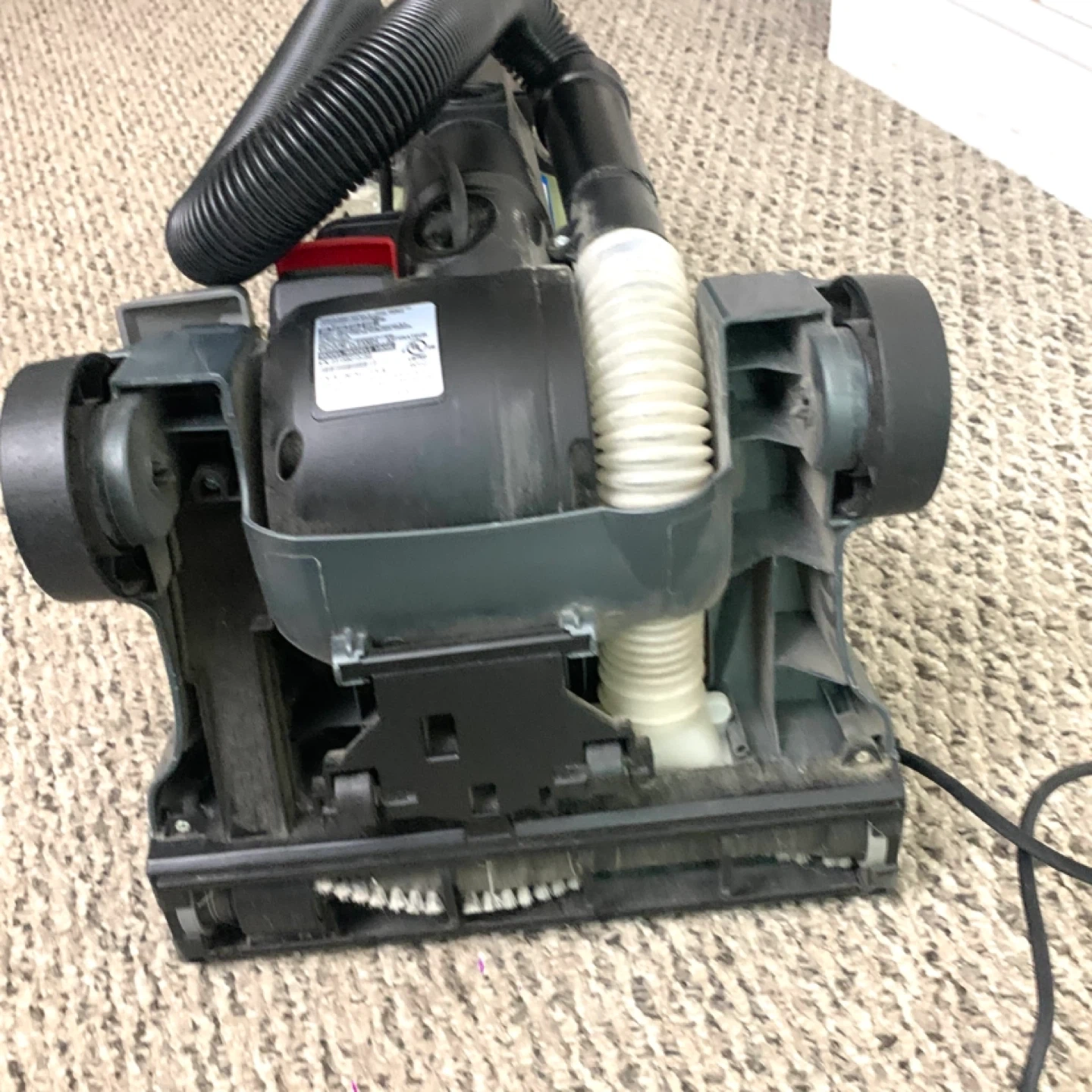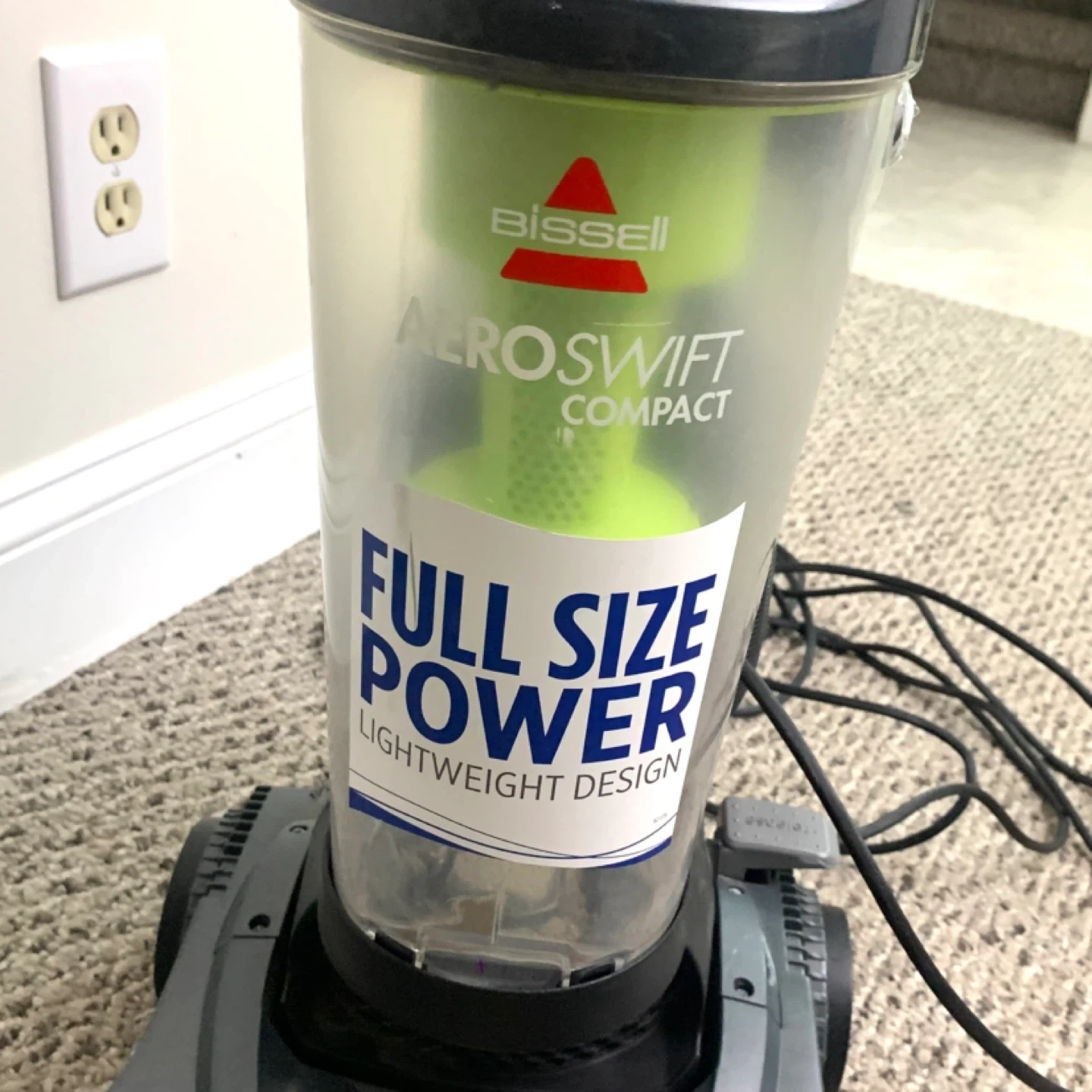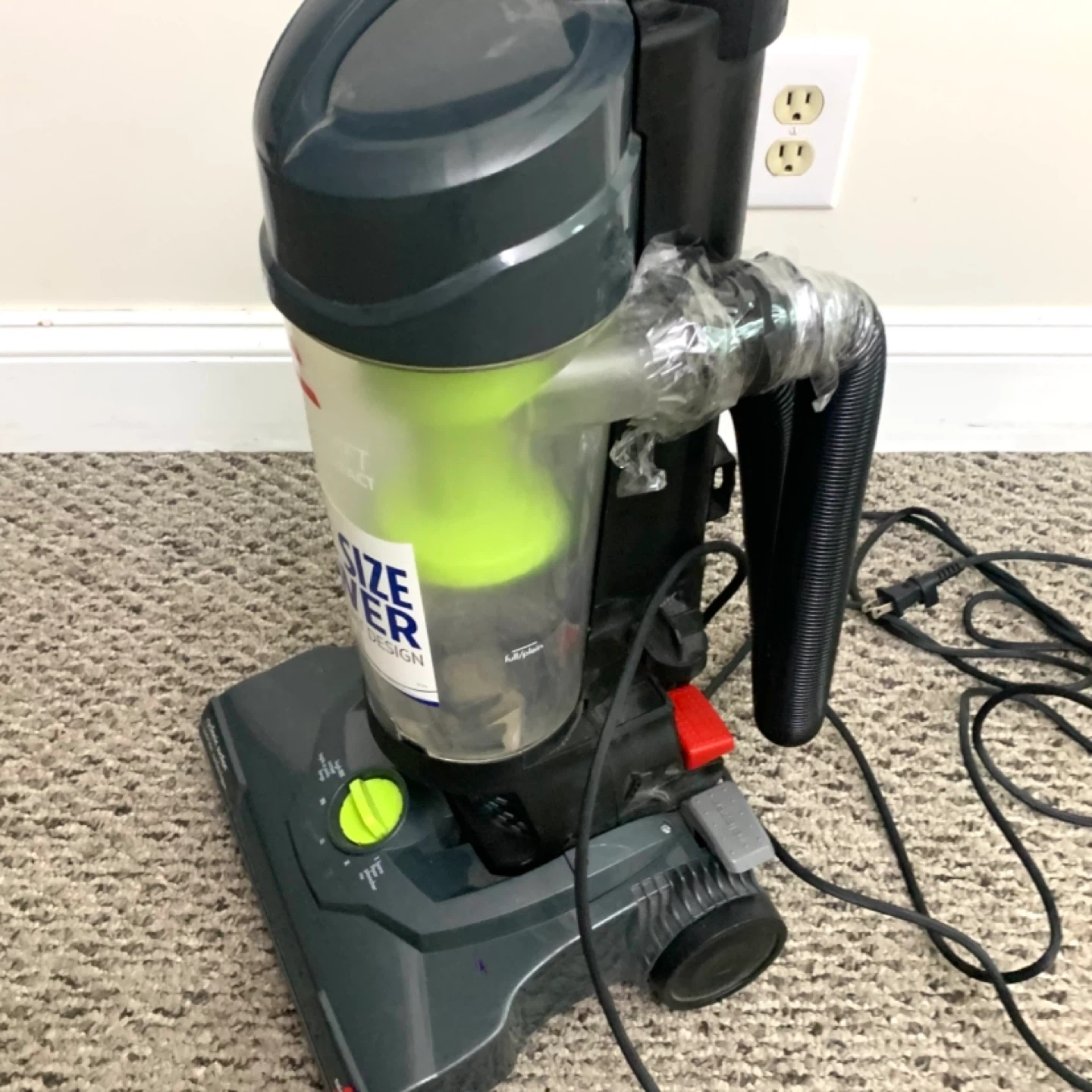 Bissell vacuum cleaner compact upright model 1808E – lightweight design with cyclonic suction, great for parts or repair. Unit runs but has suction loss due to air leak where hose was taped and likely missing internal tubing piece. Ideal for someone handy with vacuums or for parts use.