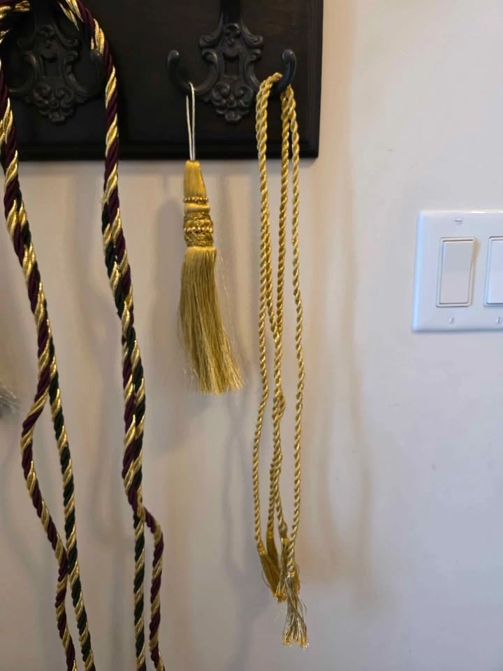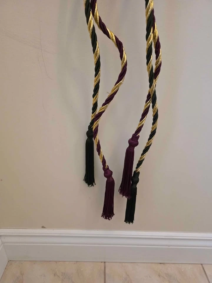 9 piece Holiday Metallic Rope Garland and Tassel Lot. Two 8 foot long Rope garlands. One burgundy and one green with metallic gold. Two 12" metallic silver tassels. Two 12" metallic gold tassels. One 10" metallic gold tassel with beads. Two 42" metallic gold double Rope with tassels. Smoke/pet free home. Pick up west end of Peterborough. $10