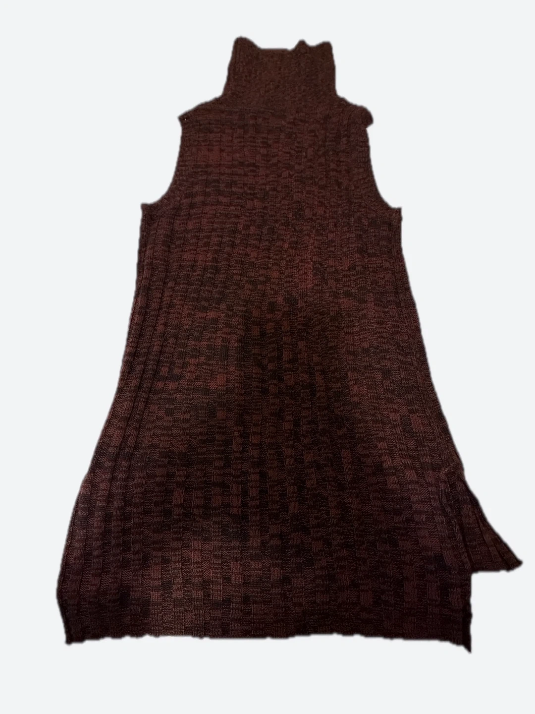A sleeveless turtleneck sweater dress in a marled burgundy and black knit. It has a high neck and a relaxed fit. This dress is great for layering in cooler weather!