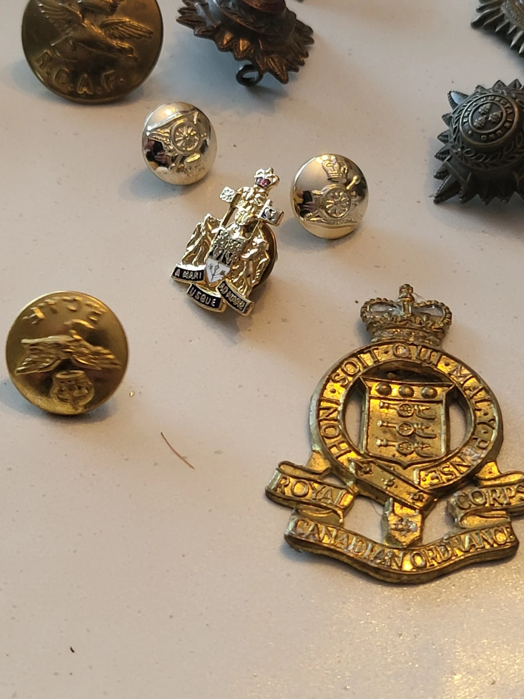 A mixed lot of vintage Canadian military badges and buttons. Includes examples from RCAF and Royal Canadian Ordnance Corps. These are collectible military insignia.