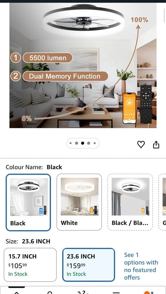 Upgrade your space with these sleek Garwarm Fandelier ceiling fans. Their low-profile design makes them perfect for bedrooms or living rooms with standard or low ceilings. I have 2 different designs/models available! Message me to see photos of the second style. Features dimmable LED lighting to suit any mood. Includes summer/winter modes for cooling and winter air circulation. Offers 6 wind speeds, all controlled via remote. Elegant black finish fits any modern decor.