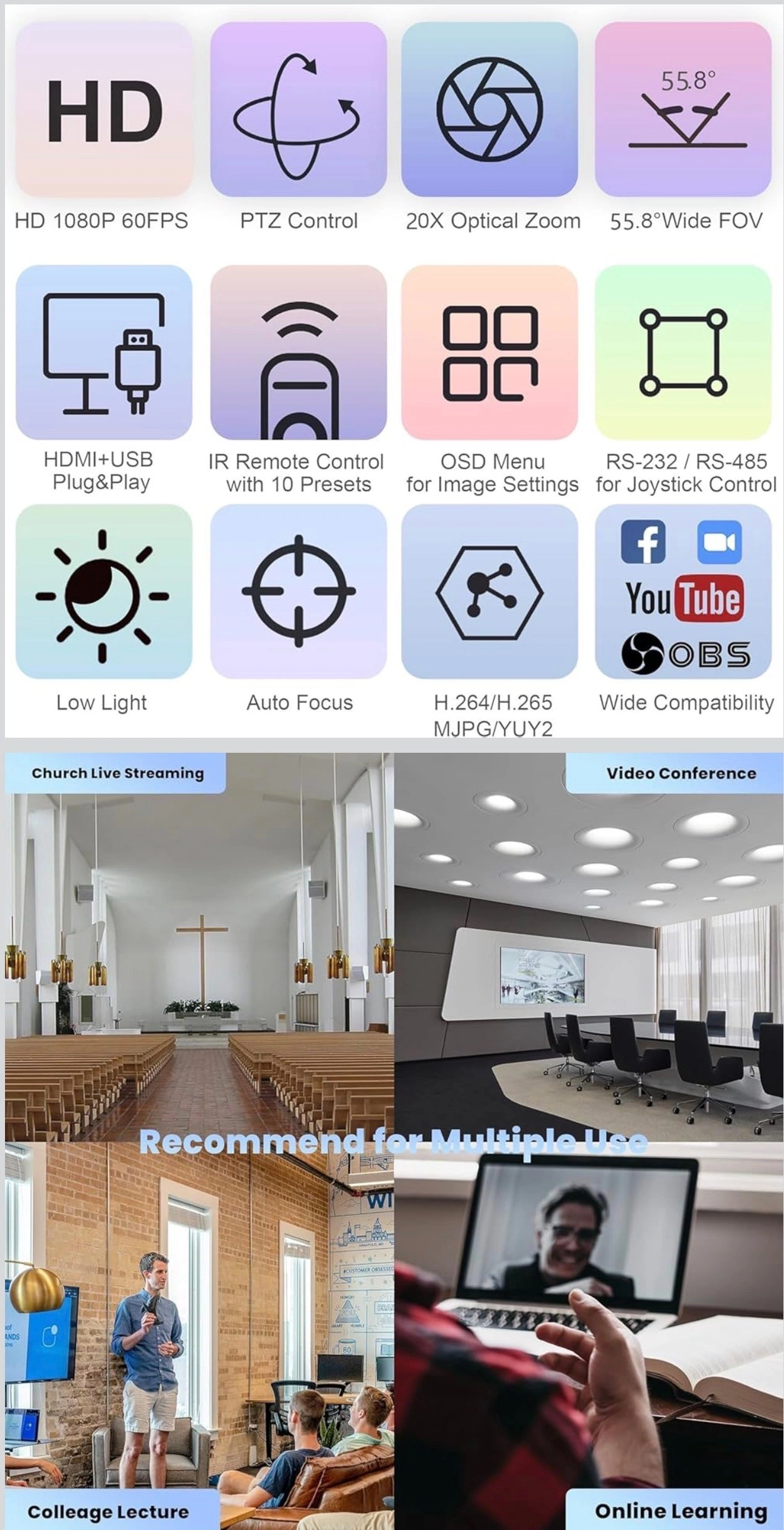 ✈【20X Zoom HDMI PTZ Camera】This 20x Zoom PTZ Camera has HDMI and USB outputs which simultaneously output 1080p video signals at 60fps, and Our Conference Camera features 20X Optical Zoom and a 55.8°FOV wide-angle lens. Accurate and stable autofocus, free control to zoom objects closer and farther to achieve the best image effect, support video Compression Format: YUV, MJPEG, H.264, makes church live or video conference more fluent and clear, ideal for medium to large meeting rooms: 60 square meters