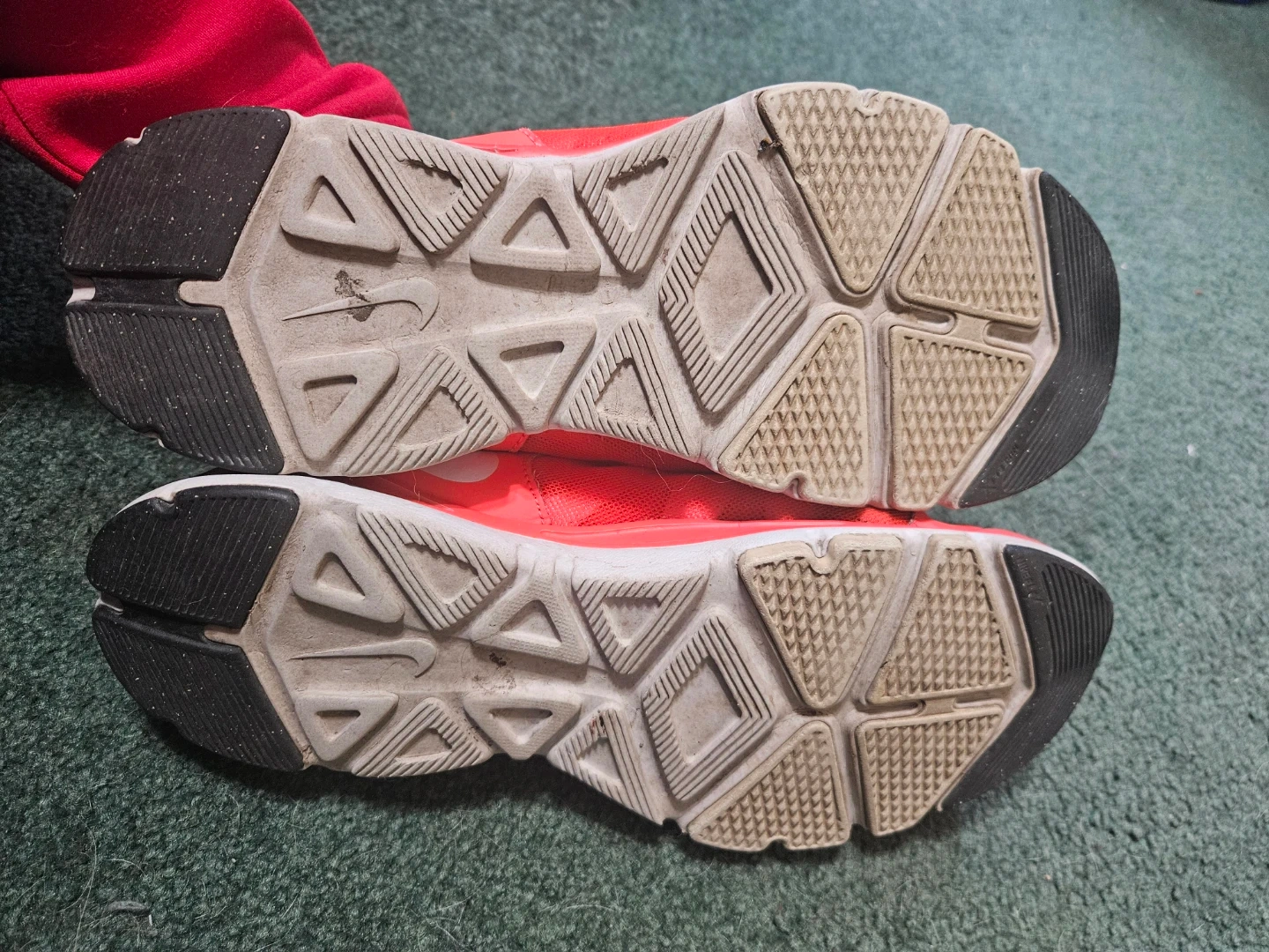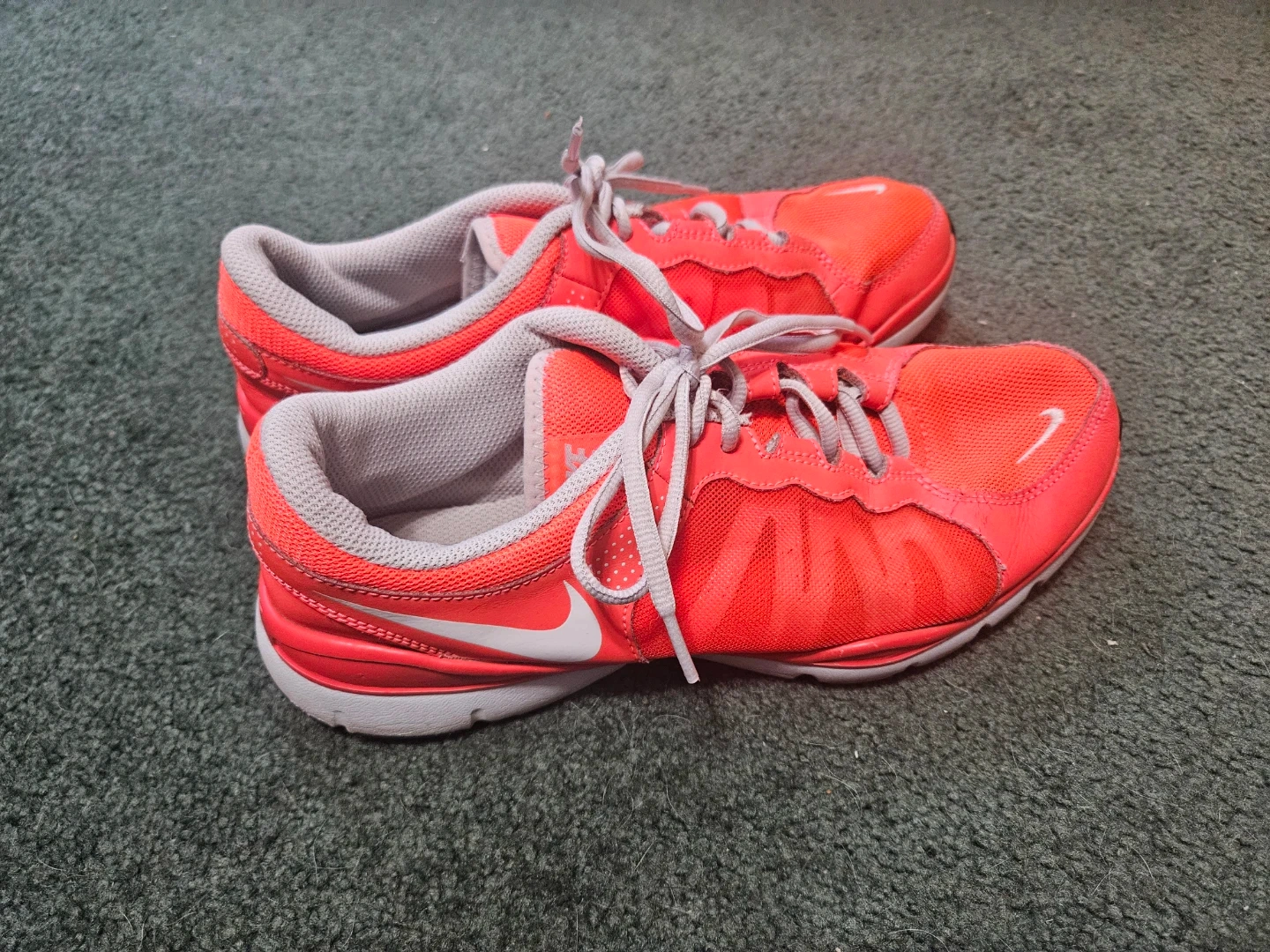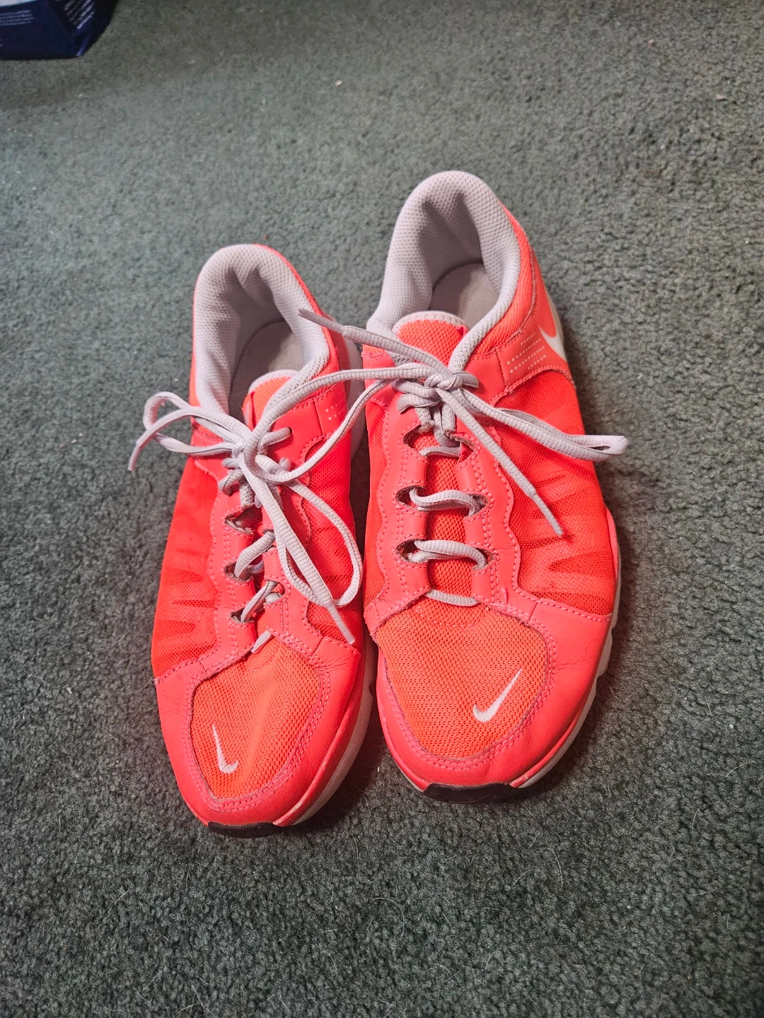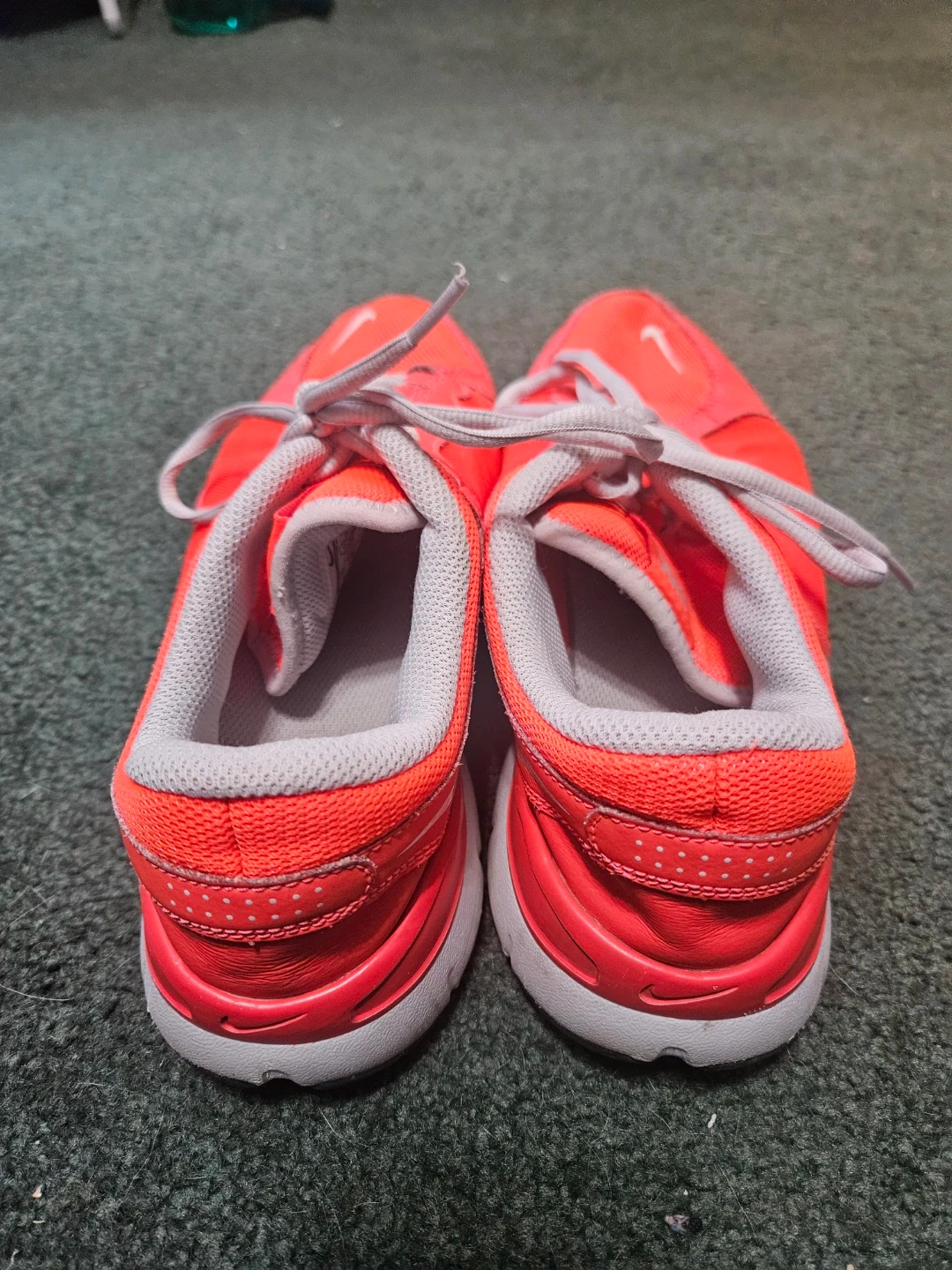 Size 10 nike women's running shoes in a bright pink / orange ish colour. Made with mesh and synthetic material for breathability. The rubber sole provides good traction. Good shoes, have not been worn much.