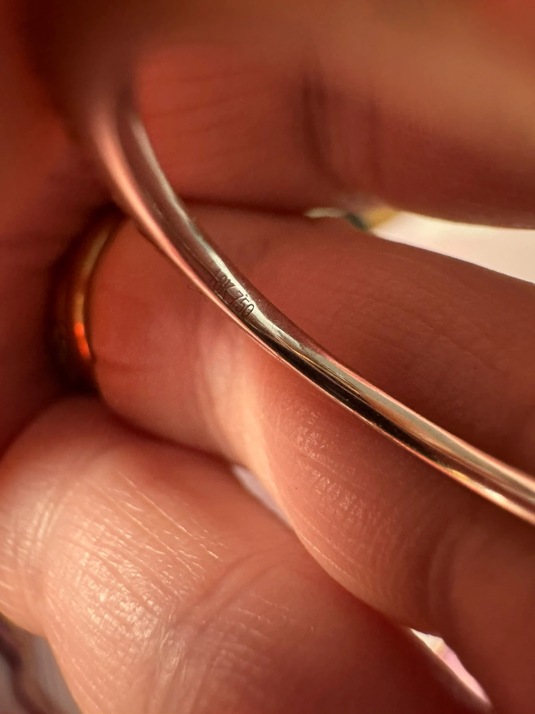 This is a beautiful 18K gold eternity ring. It's set with numerous small diamonds for a full circle of sparkle. The band is thin and elegant, making it perfect for stacking or wearing on its own.
