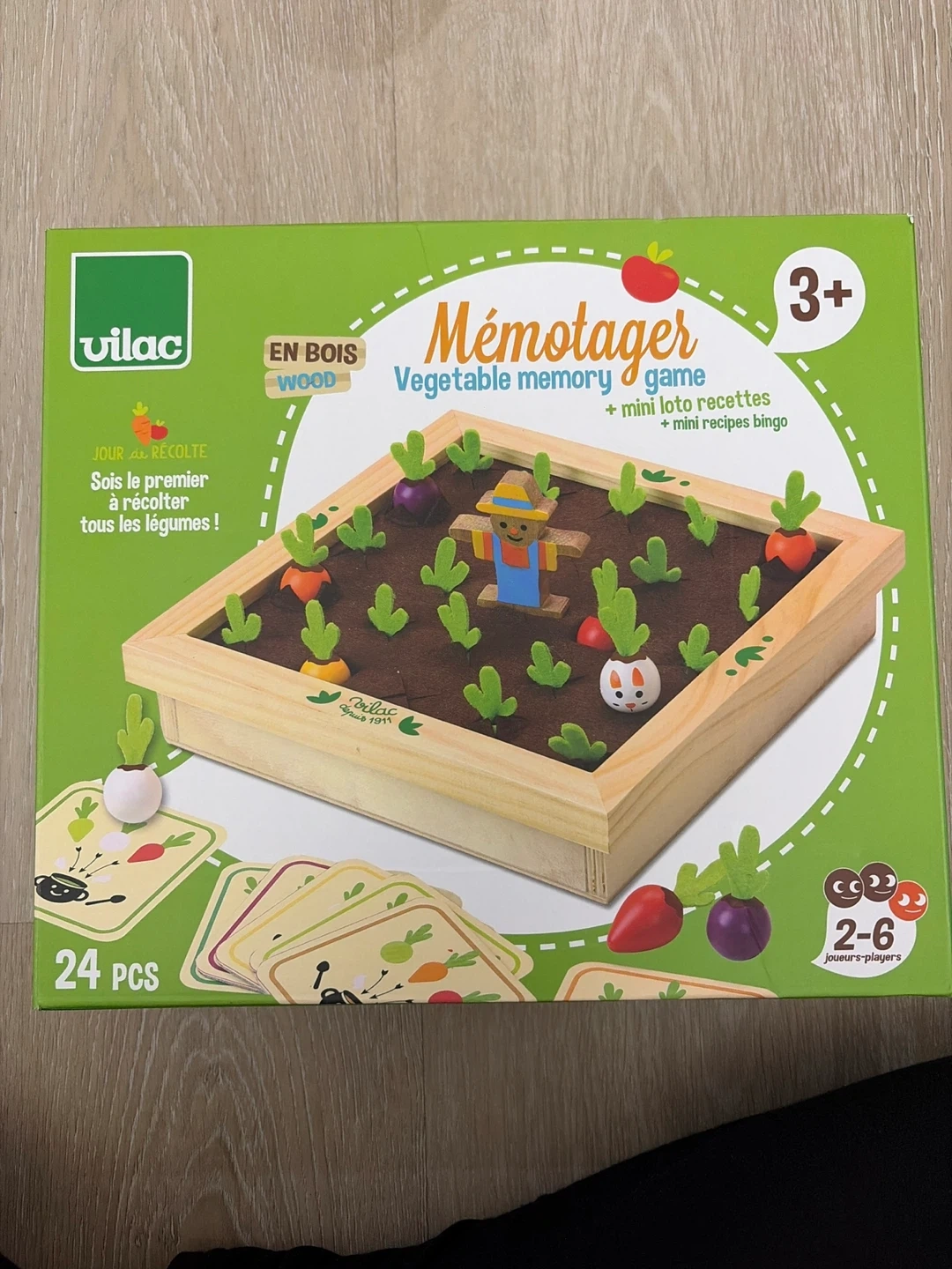 Selling a Vilac Mémotager vegetable memory game! It's a fun game for 2-6 players, suitable for ages 3+. Includes mini loto and bingo recipes, perfect for little ones who want to be the first to harvest all the veggies!