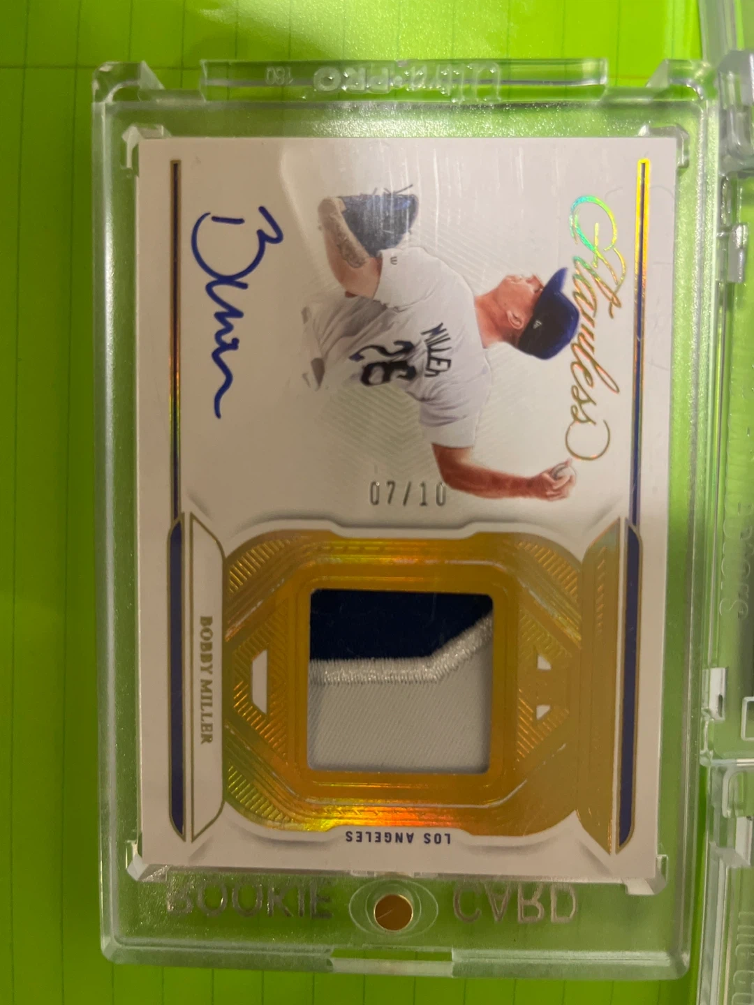 Selling a Bobby Miller Rookie card from Flawless. It features an autograph and patch. Numbered 07/10 and from Los Angeles.
