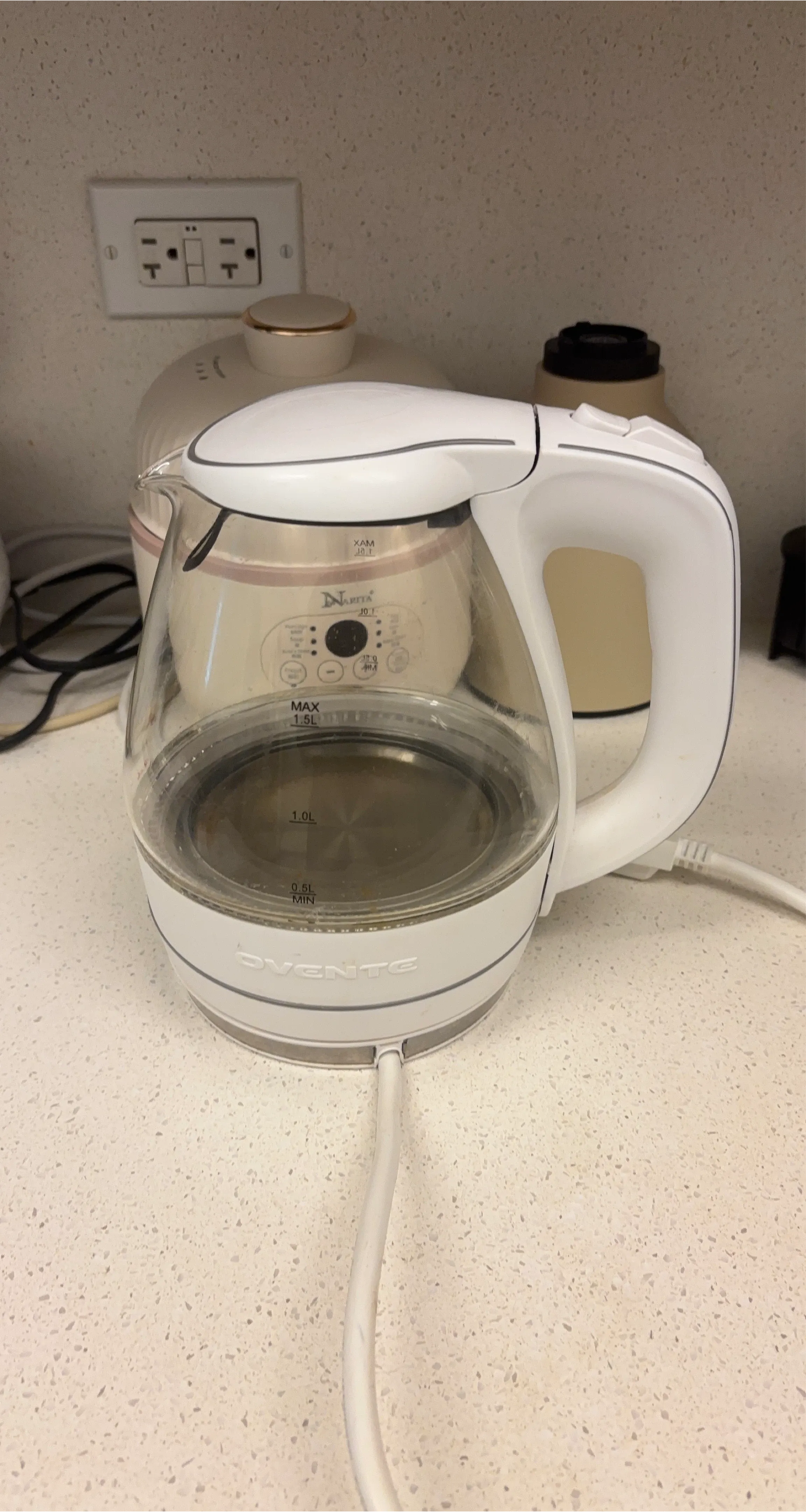 Selling a used Ovente electric kettle. It's in good condition and ready to use! It has a clear glass body with a white handle and base. Perfect for quickly boiling water for tea or coffee