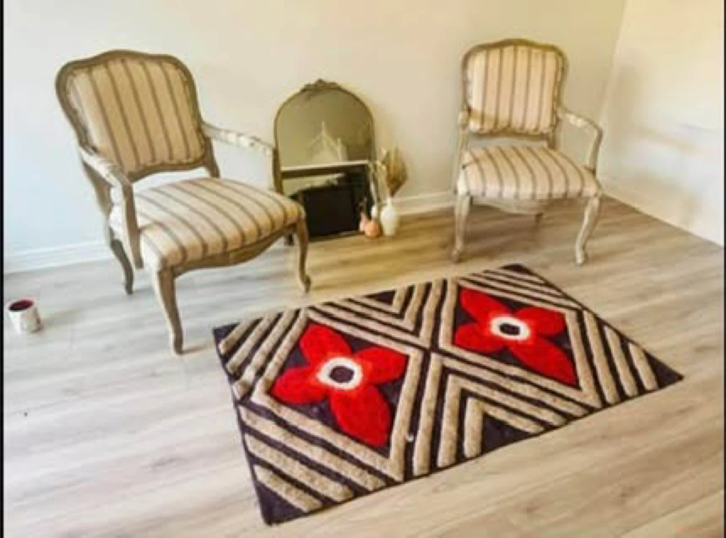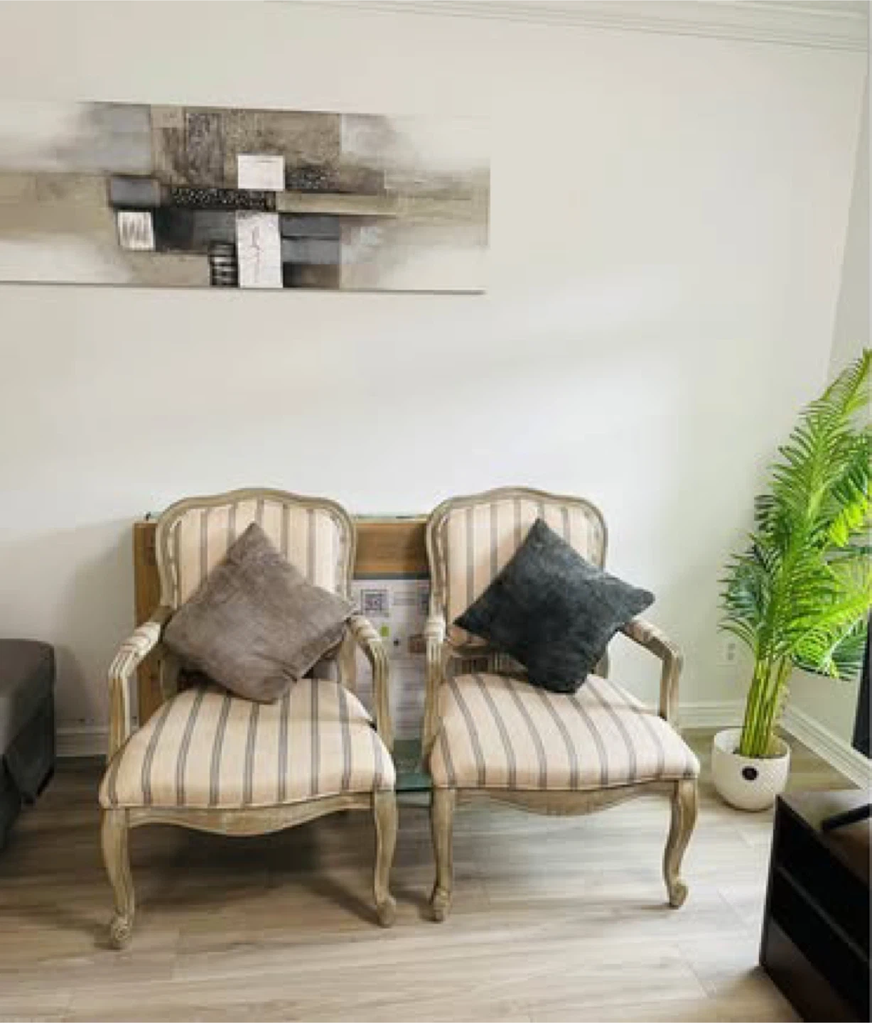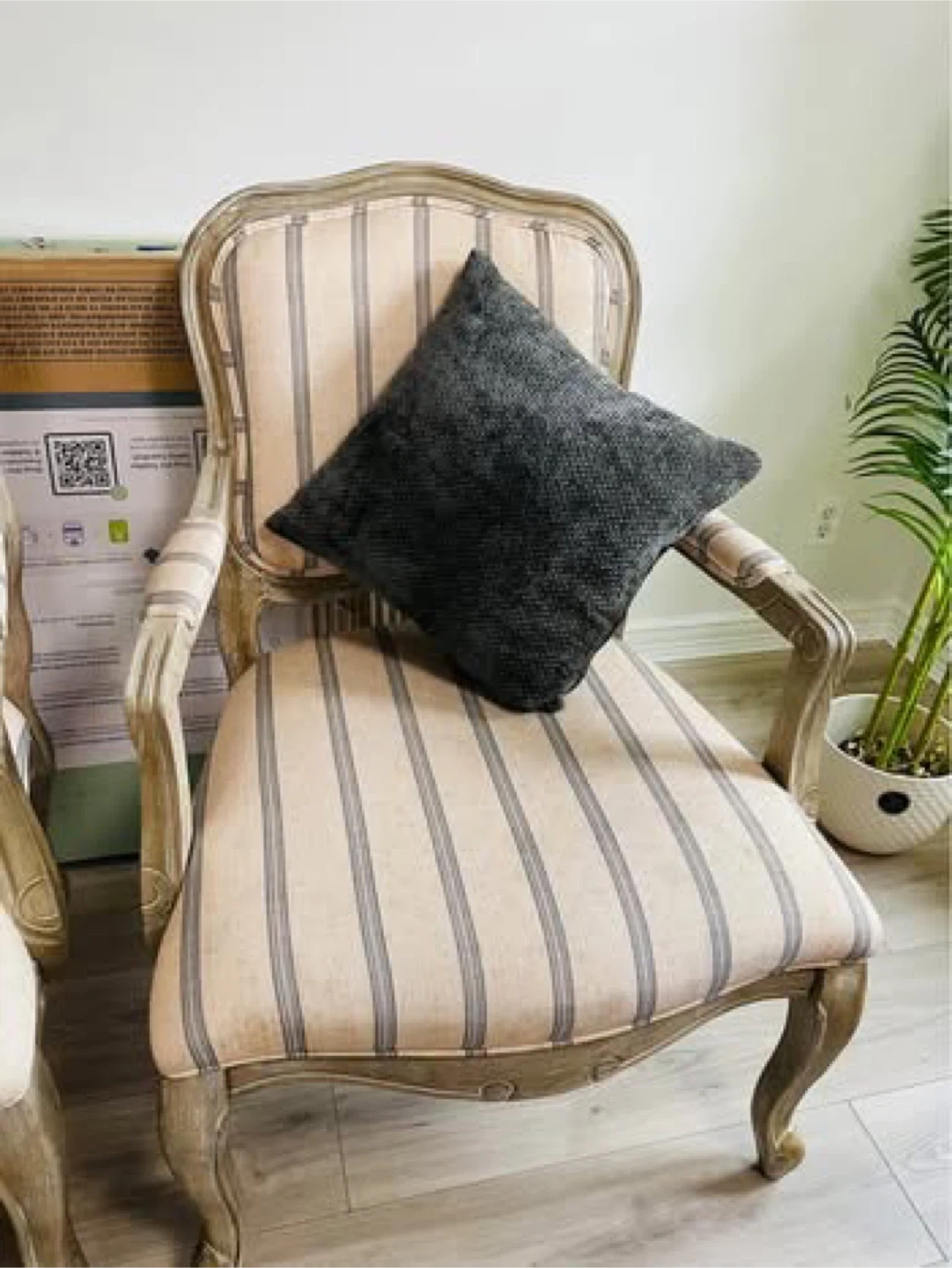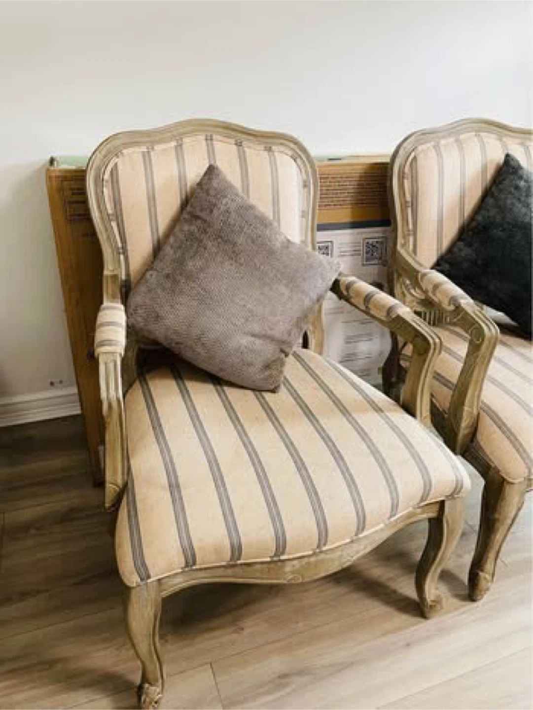 These accent chairs feature a classic French country style with striped upholstery and a distressed wood frame. They're perfect for adding a touch of elegance to any living space. Each chair measures 38 1/4" tall, 26 3/4" wide, and 31" deep.