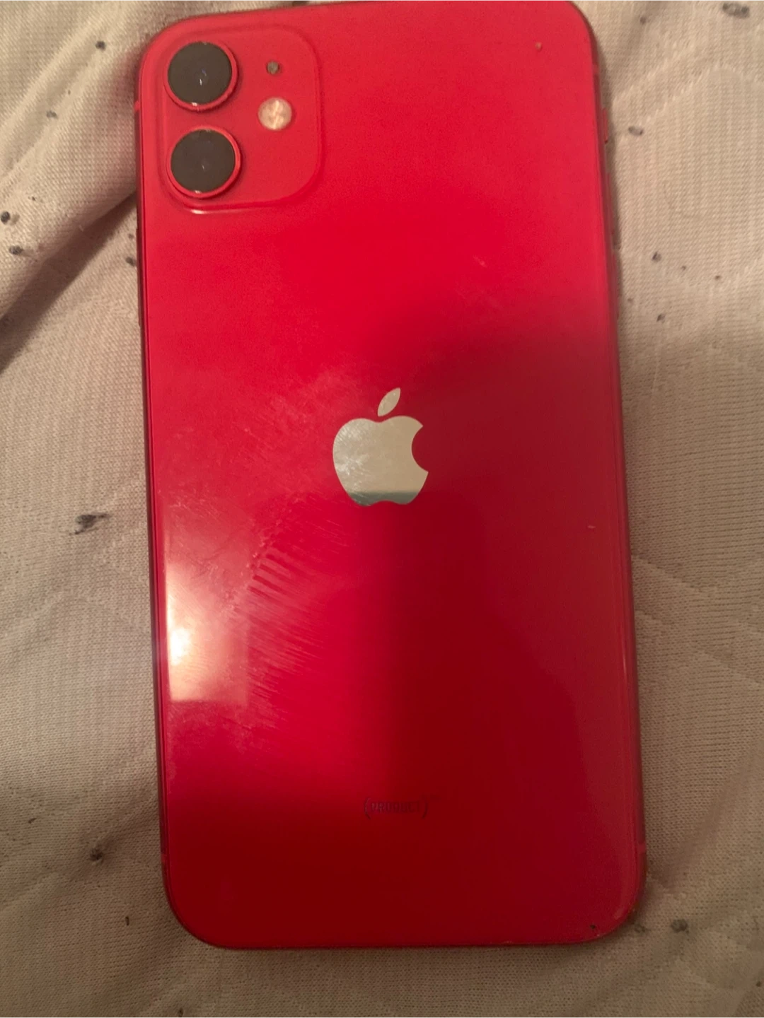 This is an Apple iPhone 11 in red. It features a dual-camera system and a 6.1-inch Liquid Retina display. It's powered by the A13 Bionic chip.