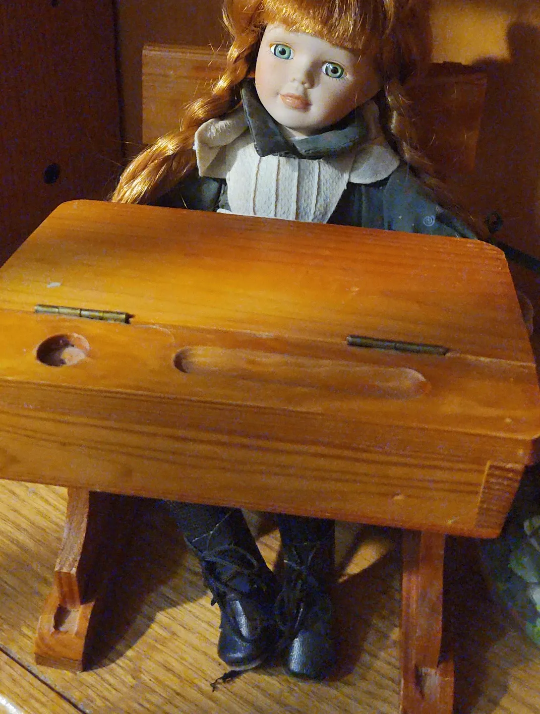 This vintage porcelain doll has beautiful auburn hair and bright blue eyes, dressed in a school uniform. It's posed with a charming miniature wooden school desk that has a hinged top. The doll's attire and the detailed desk add a touch of nostalgia. This set is perfect for collectors of vintage dolls or miniature furniture displays.