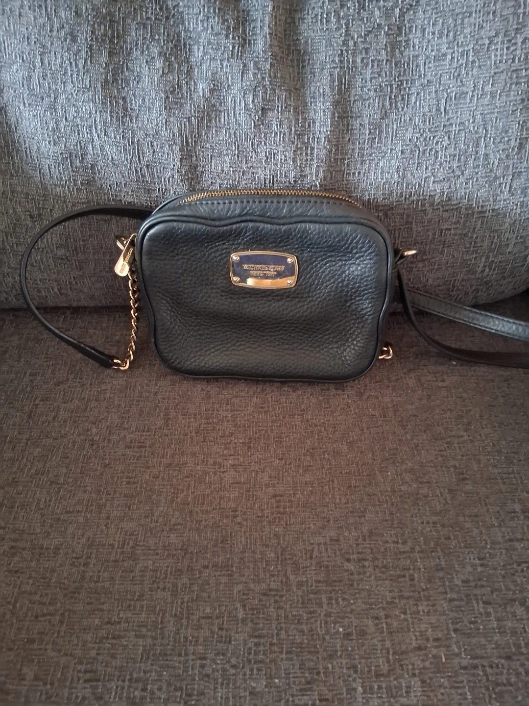 Michael Kors black leather camera bag with gold hardware. Features a pebbled leather exterior and a zippered top closure. It's perfect for carrying essentials on the go!