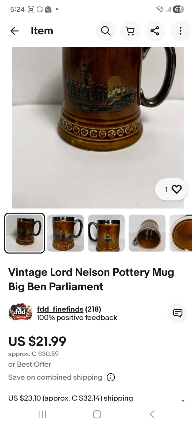 Buy & SellVintage Lord Nelson Pottery MugVintage Lord Nelson Pottery Mug$20Vintage Lord Nelson beer mug. The bottom of the mug is stamped with the Lord Nelson Pottery England logo 7-69WHERE TO MEETWindsorView MapSELLERJohnS Central211 review0 chats·1 favorites·5 viewsSEND CHAT TO SELLERHi John! I’m interested in your listing.Hi John! I’m interested in your listing.Get the Karrot app to chatSign In to chat