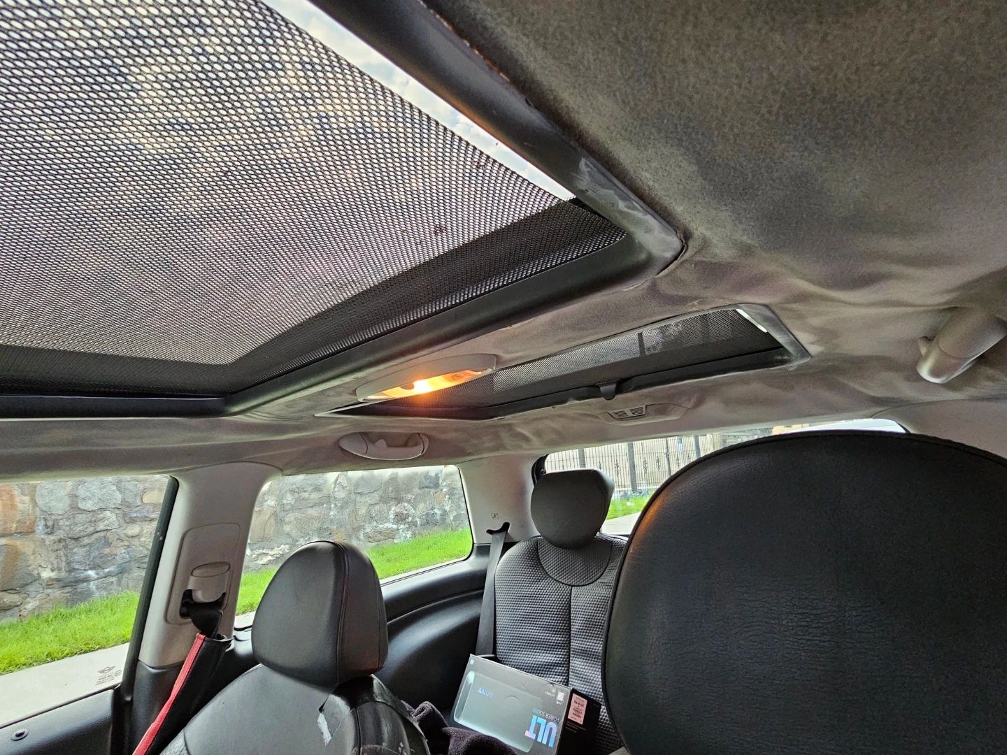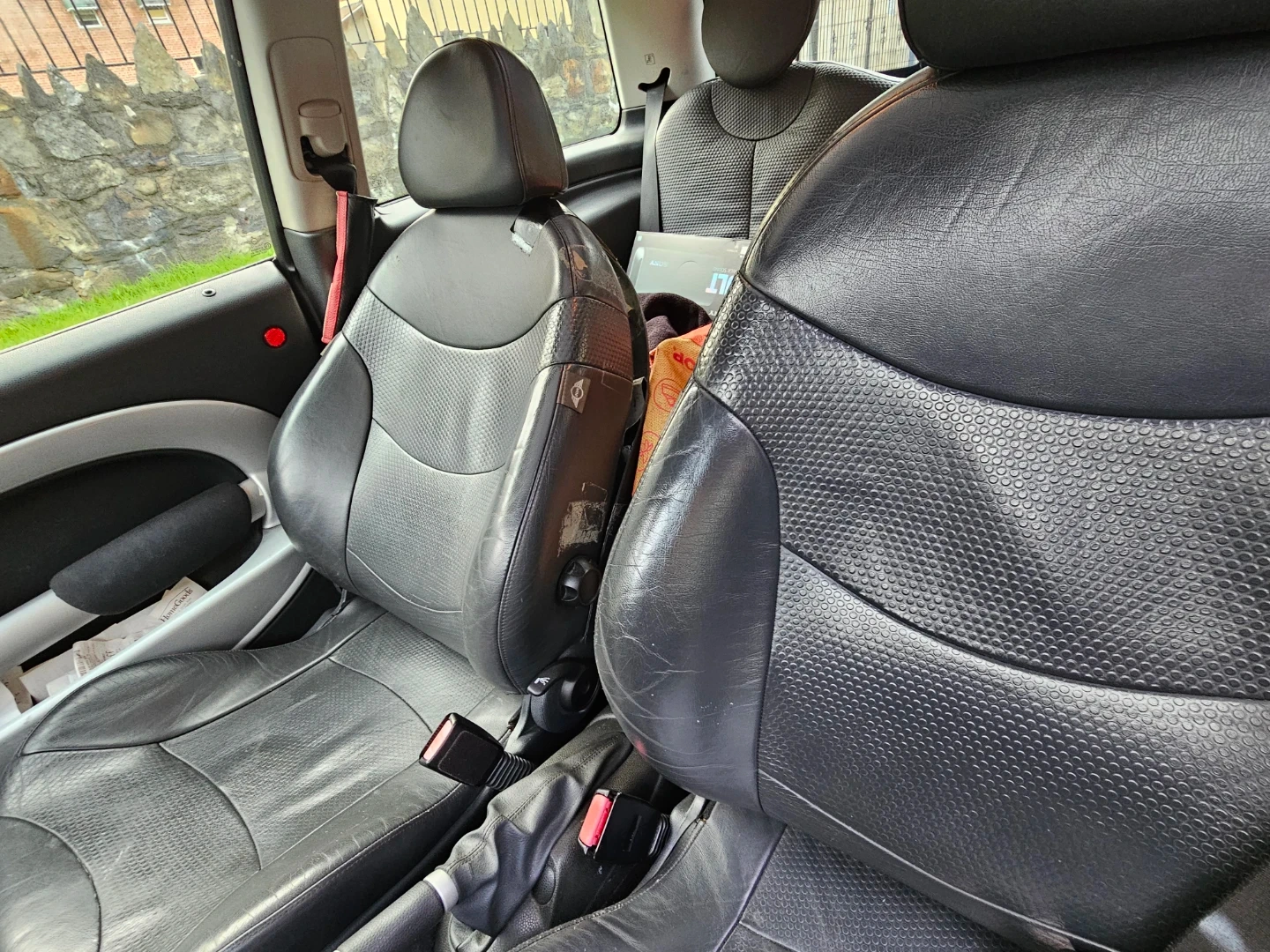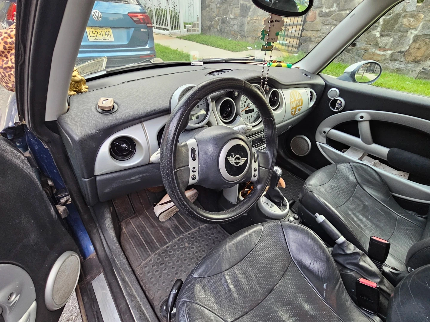 This listing includes interior parts from a Mini Cooper. It has leather seats and a panoramic sunroof. Also visible is the dashboard with the original Mini Cooper radio and gear shifter.