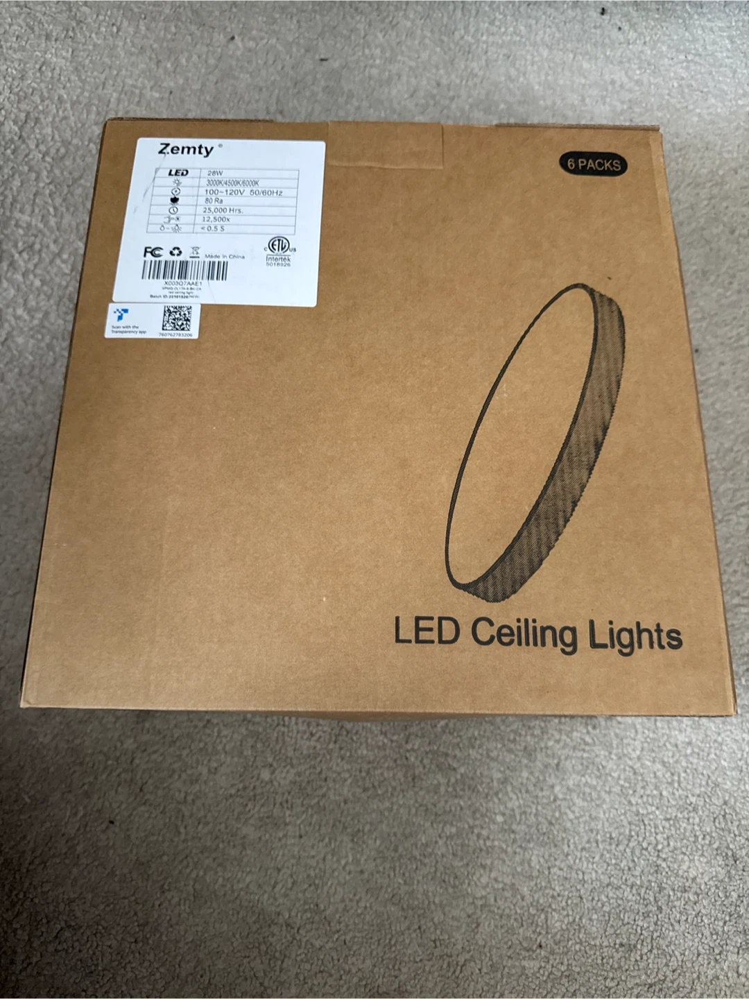 Zemty LED Ceiling Lights, 28W. These lights have a 3000K/4500K/6000K colour temperature and 80 Ra. They're rated for 25,000 hours of use. Includes 6 packs.