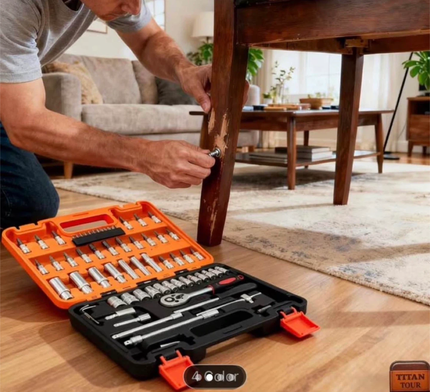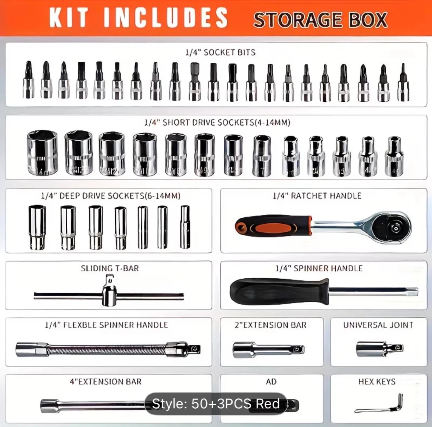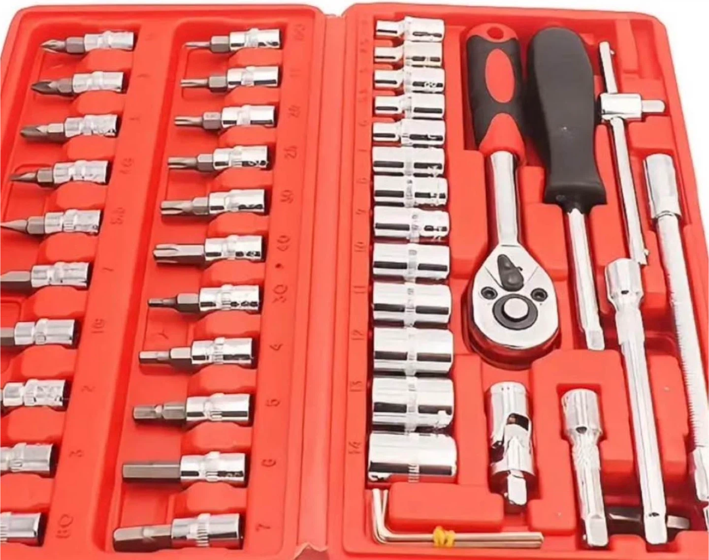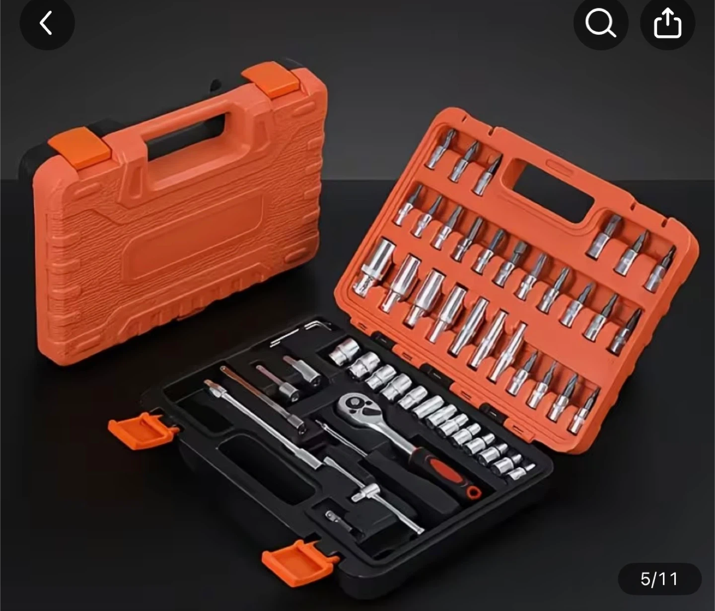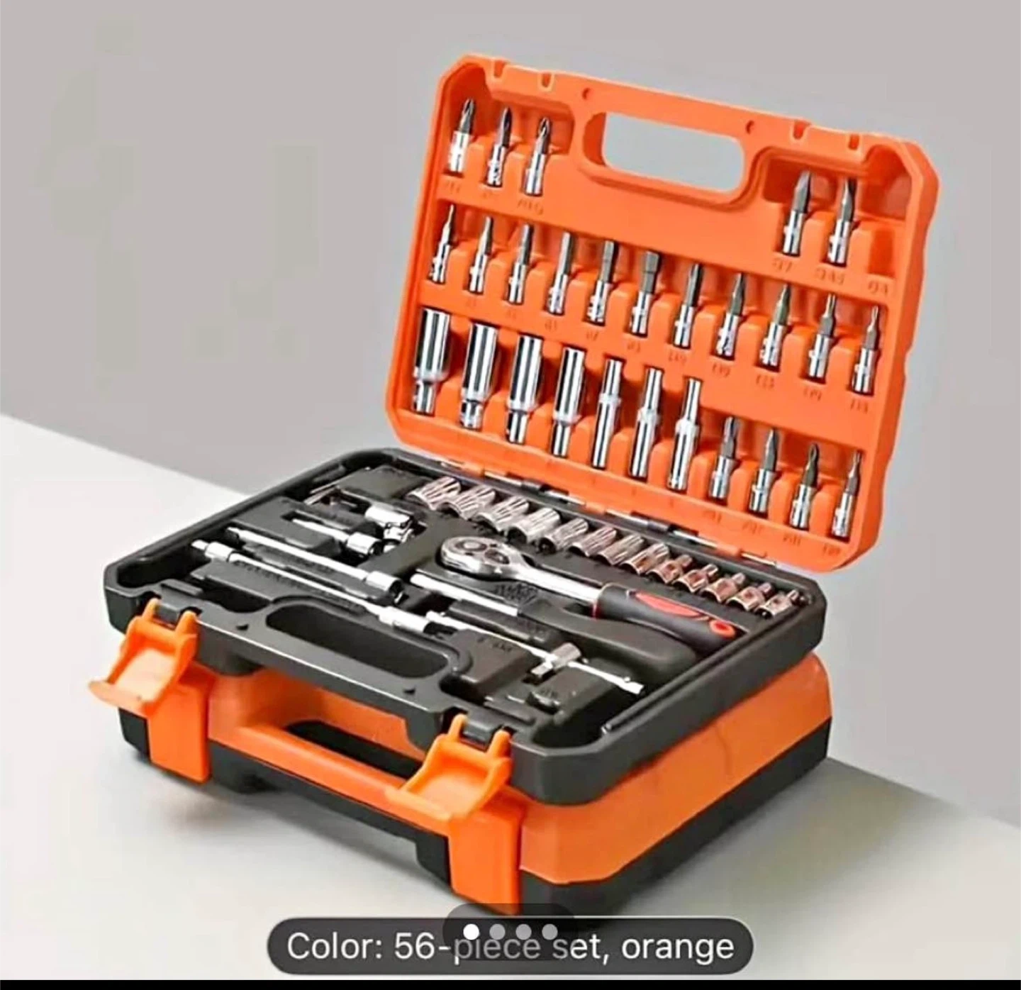 This is a 56-piece tool set with a ratchet wrench and various sockets and bits. It comes in a durable orange and black carrying case. This set is great for general repairs and maintenance.