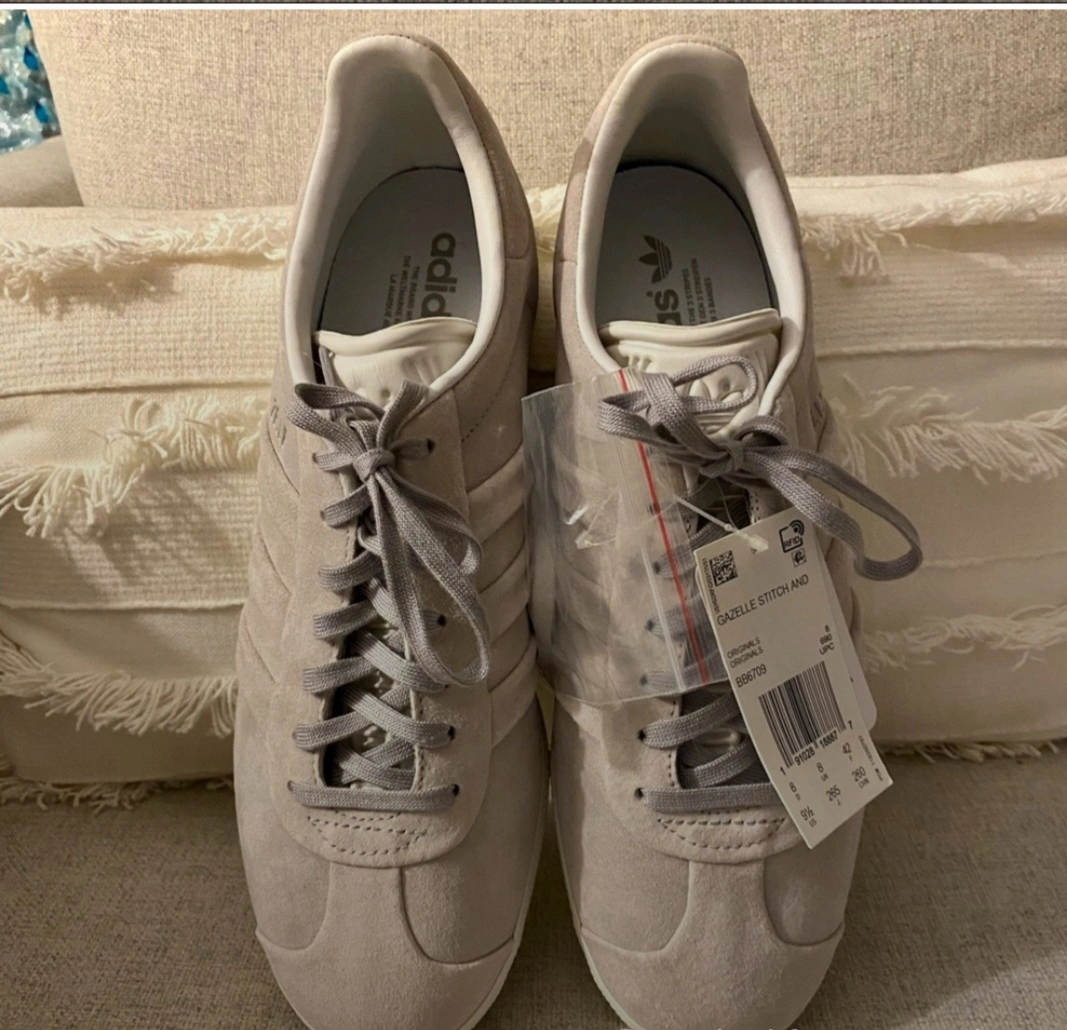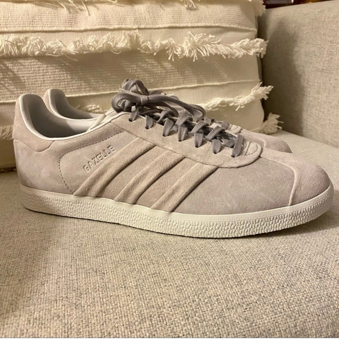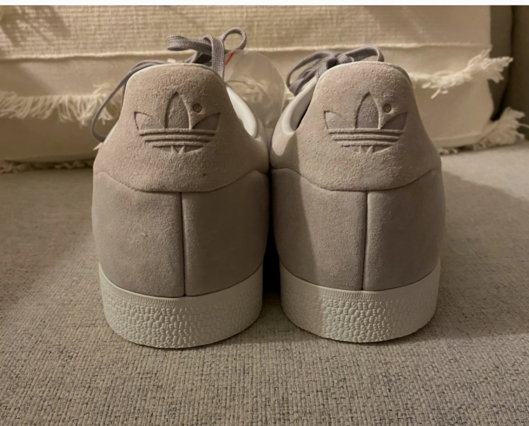 These sneakers have a neutral, light gray colour. Suede uppers with signature three stripes.