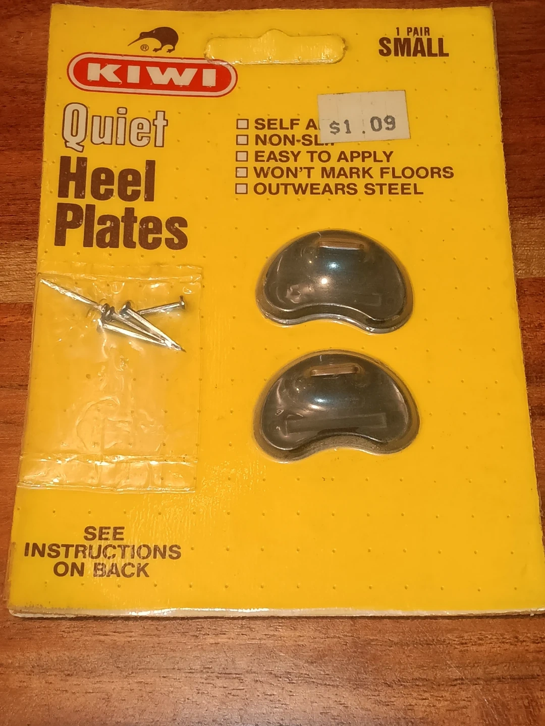 Kiwi Quiet Heel Plates in small size. This package includes 1 pair of heel plates and nails. They're easy to apply and won't mark floors.