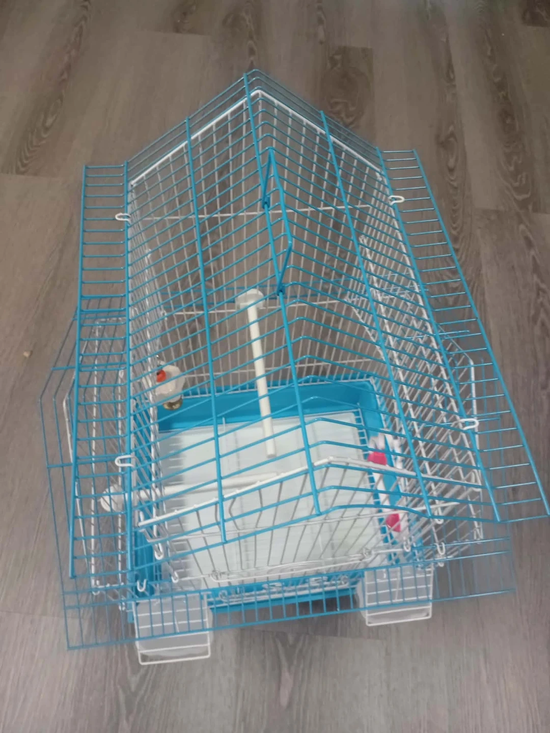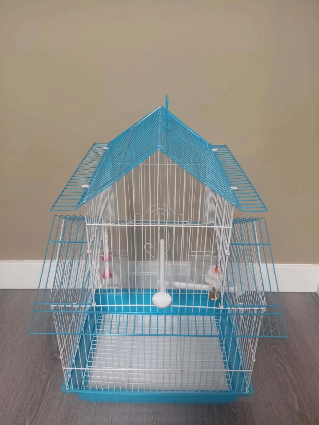 This bird cage is blue and white and includes a perch and feeders. It's designed with two levels for birds. It's a sturdy cage suitable for small to medium birds. There is a small crack due to shipping issues. Brand new, only out of box, no box included.