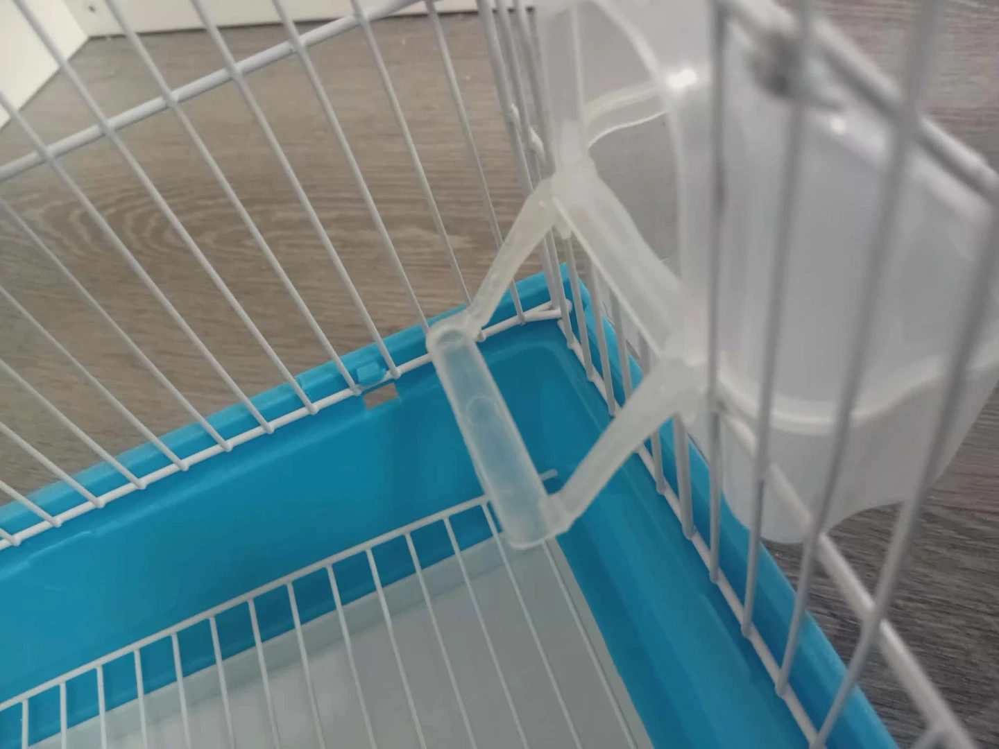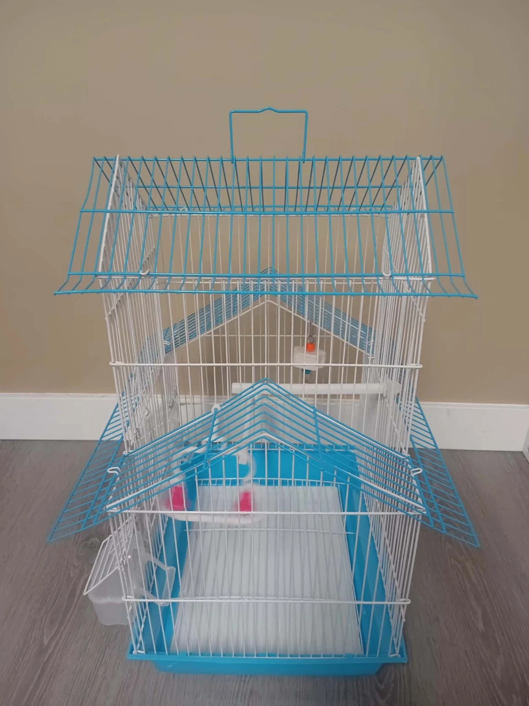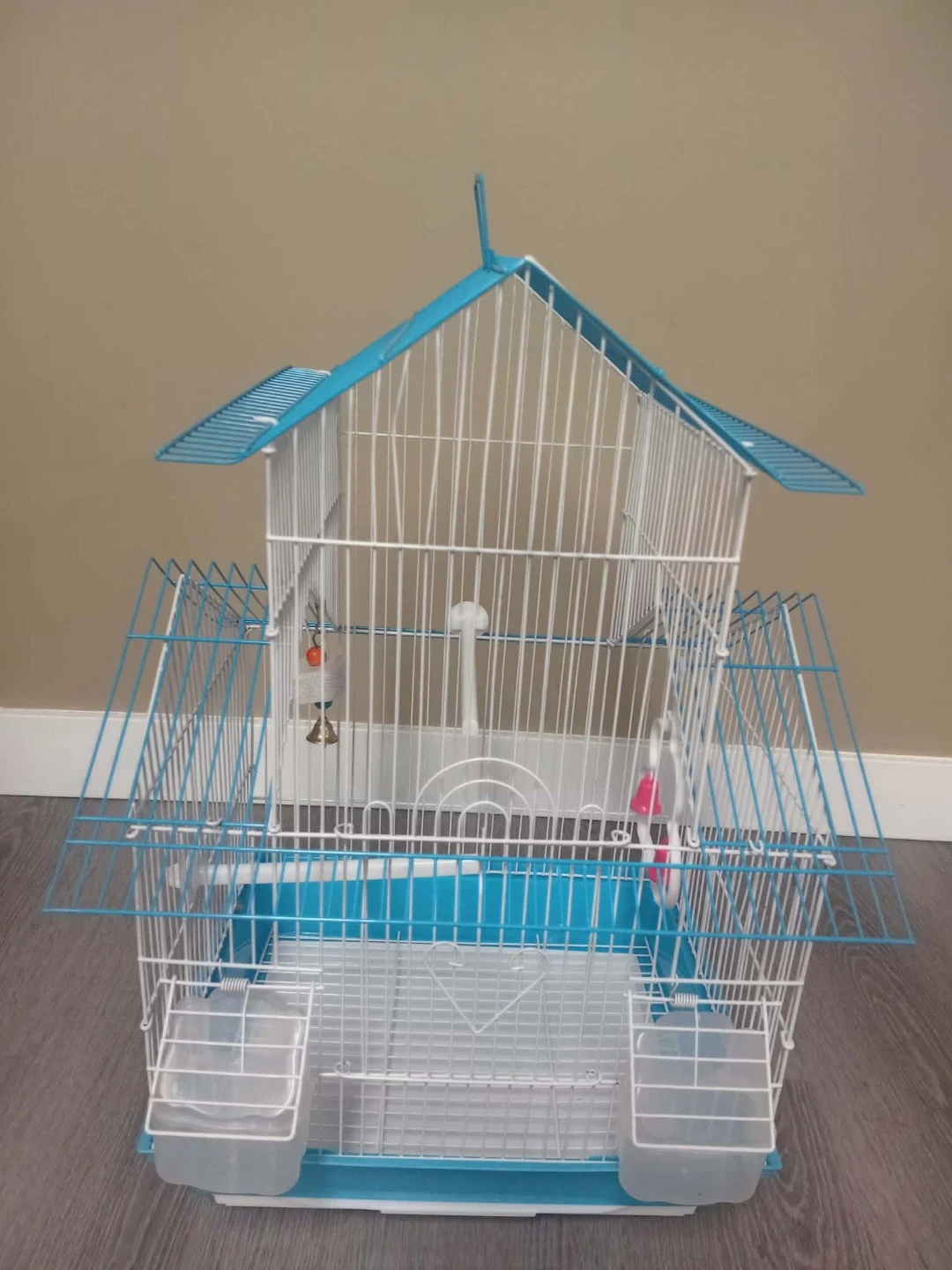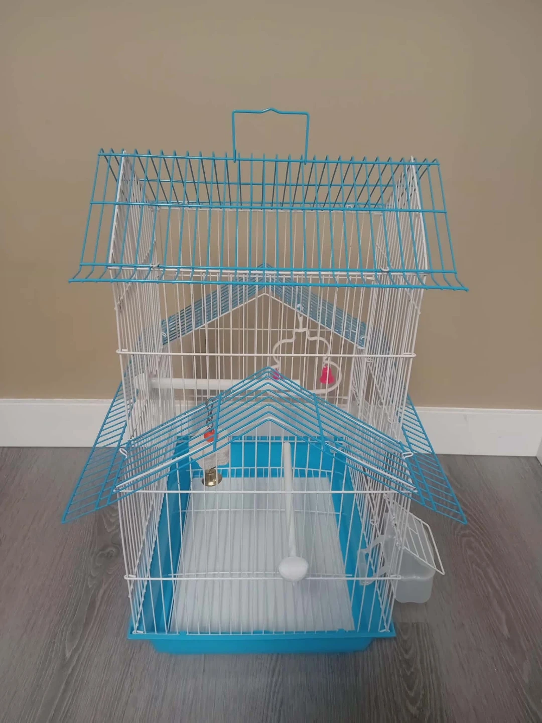 This bird cage is blue and white and includes a perch and feeders. It's designed with two levels for birds. It's a sturdy cage suitable for small to medium birds. There is a small crack due to shipping issues. Brand new, only out of box, no box included.