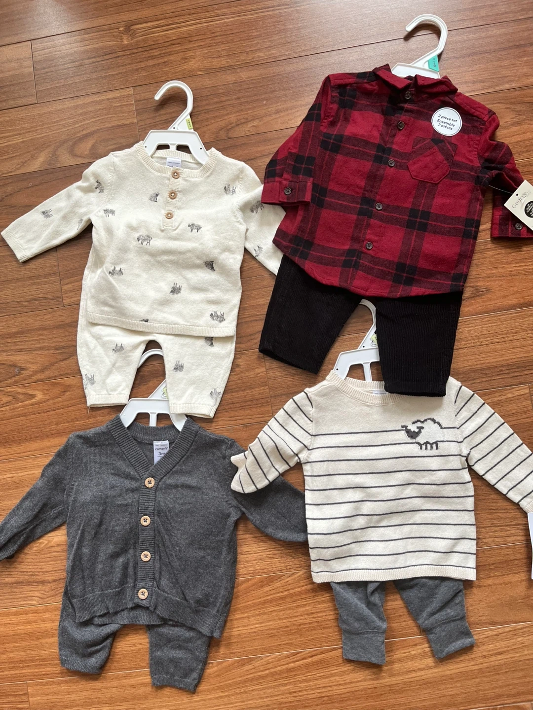 This Carter's baby boy's 5-piece outfit set includes a plaid shirt, a patterned long-sleeve top, a grey cardigan, and two pairs of pants. 5.00 each or $15.00 for all. All still have tags never been worn.