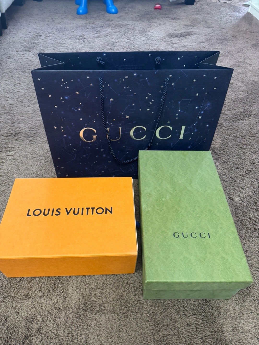 These designer boxes and bag offer a touch of luxury and style, perfect for collectors or those looking to add a sophisticated flair to their storage solutions. The items include a Gucci box, a Louis Vuitton box and a Gucci bag. Please note that these items are EMPTY!!!
