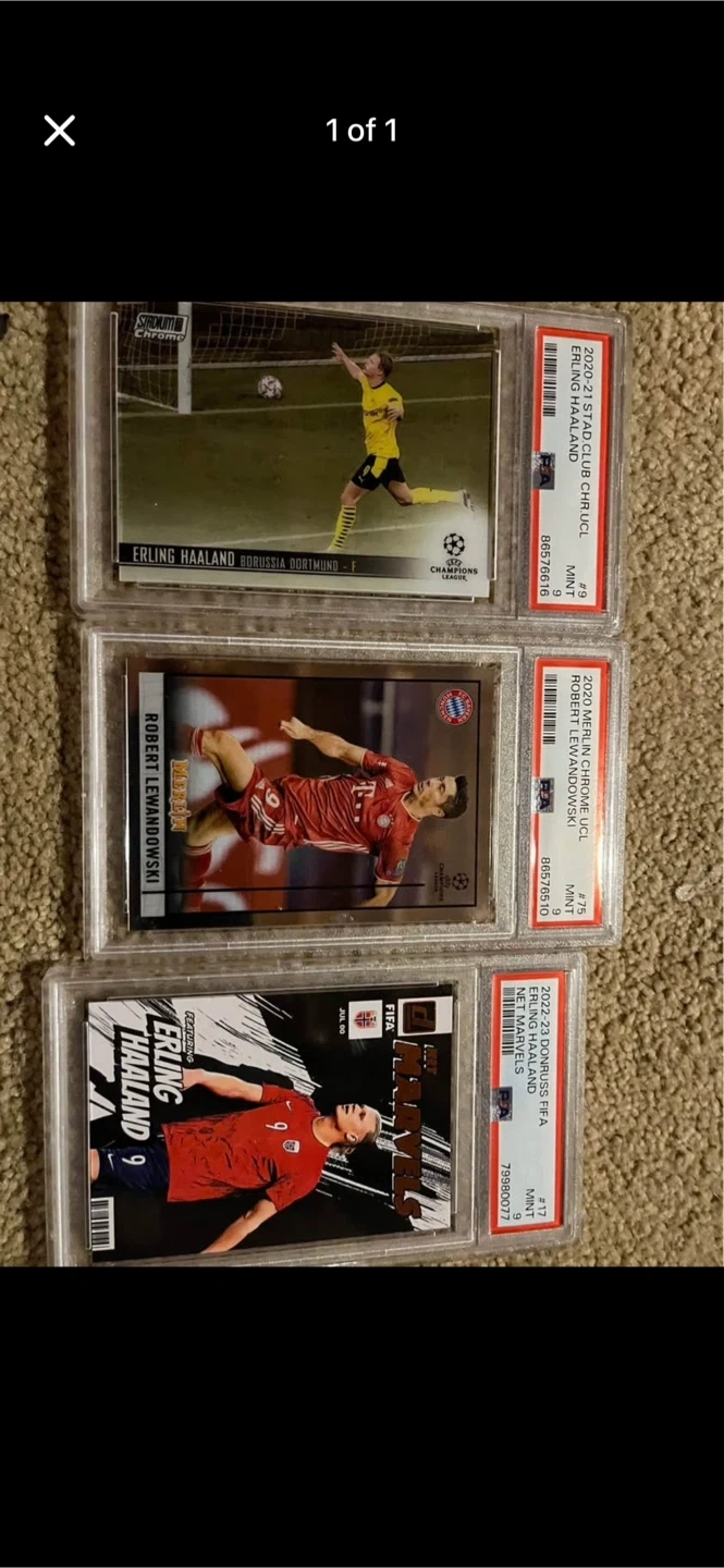 Includes 2020-21 Topps Chrome UCL Erling Haaland (PSA 9), 2020 Merlin Chrome UCL Robert Lewandowski (PSA 9), and 2022-23 Donruss FIFA Erling Haaland (PSA 9). Mint condition cards ready for any collector!