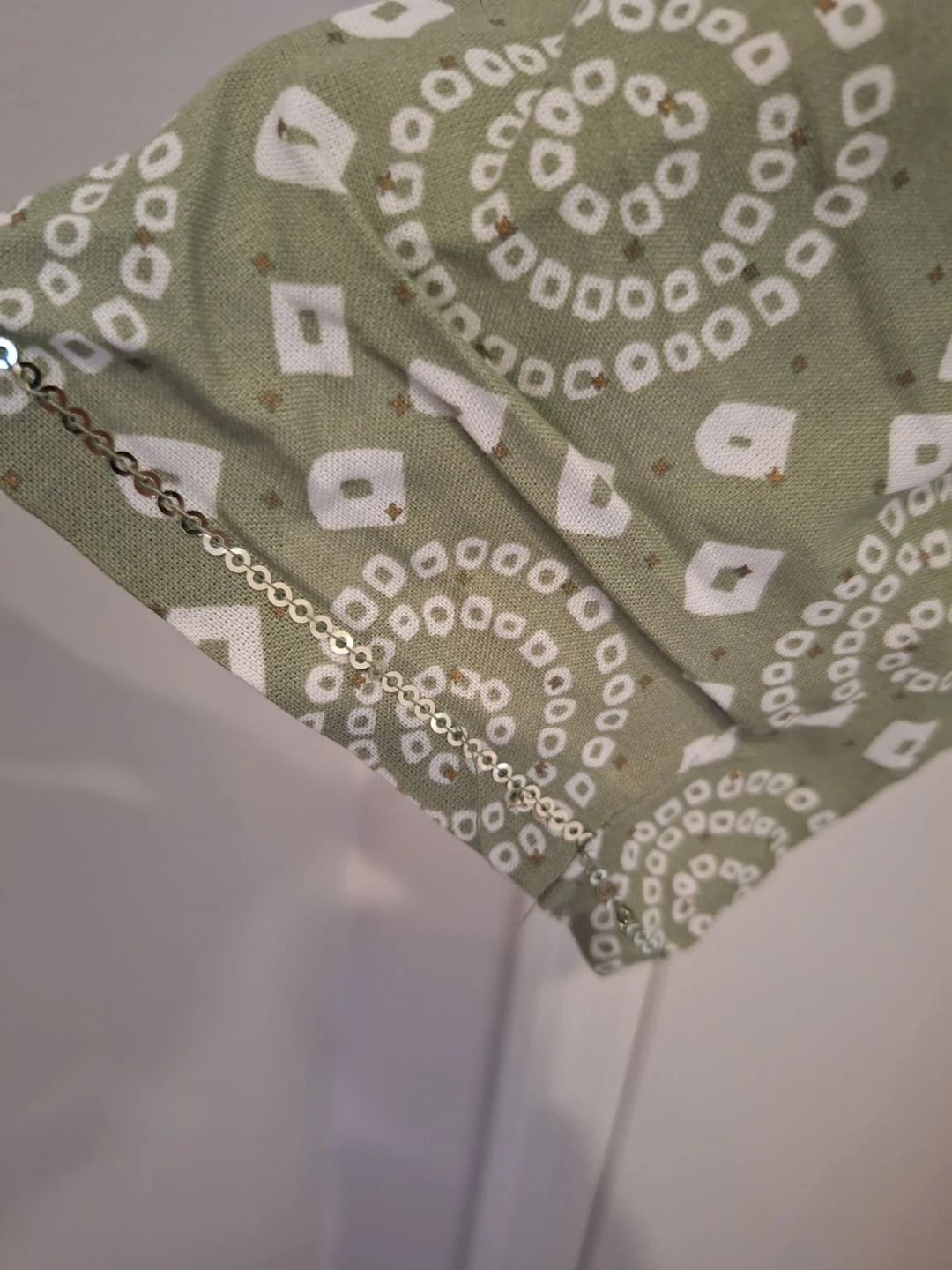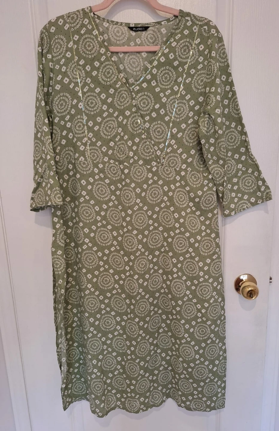 NEW! Perfect for Summer! Pretty, light olive green kurta. Has some sequin work on front and sleeves. Brand - Zudio. Bought from India last year, never worn as it was a bit small. 100% Rayon.