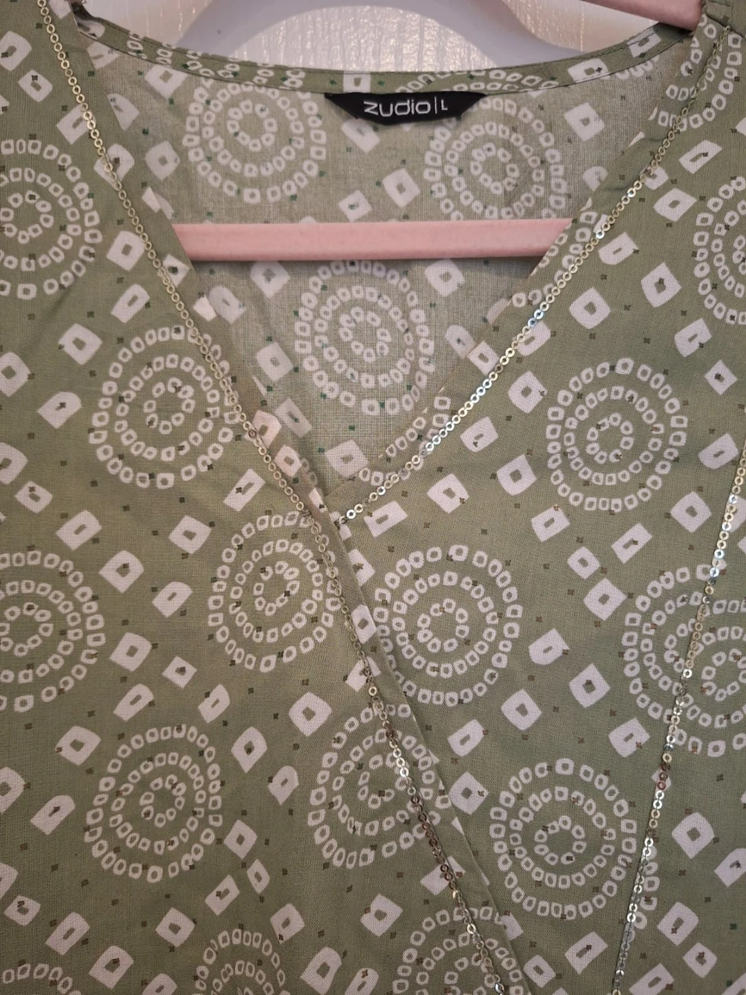 NEW! Perfect for Summer! Pretty, light olive green kurta. Has some sequin work on front and sleeves. Brand - Zudio. Bought from India last year, never worn as it was a bit small. 100% Rayon.