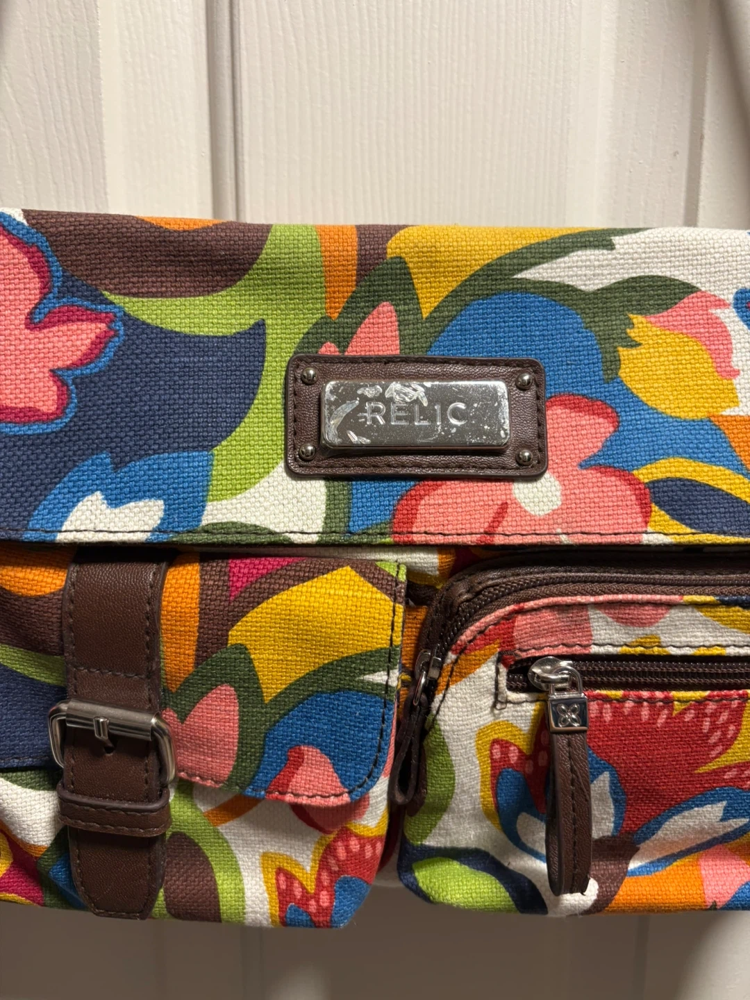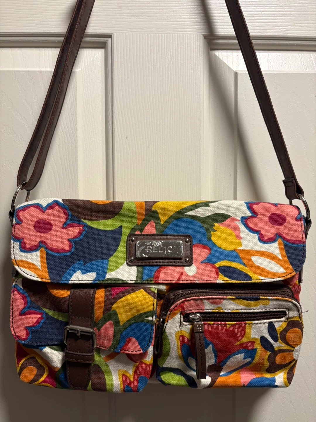 Relic crossbody bag with a vibrant floral print. It features a buckle closure on the front flap and a zippered pocket. It's perfect for adding a pop of colour to your day! The bag is in new condition, never been used! Pick up in Chestermere.